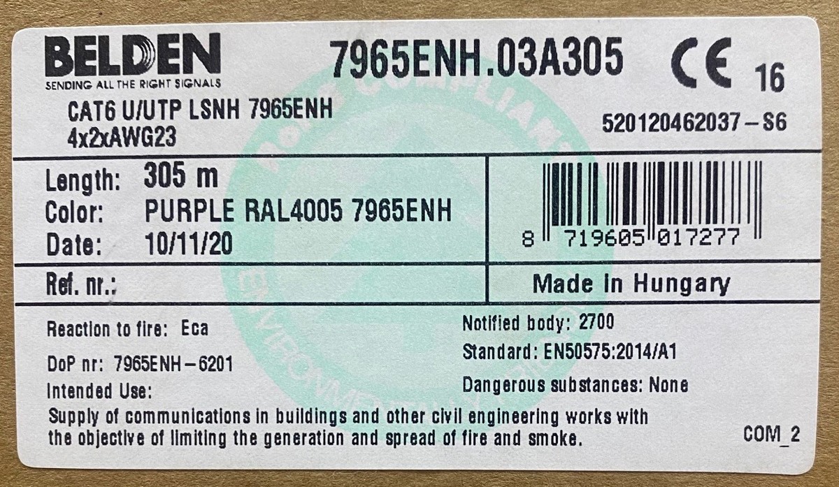 Belden installation cable - category 6 is a high-quality cable designed for horizontal structured cabling inside buildings. The cable is supplied in an unshielded version with the LSOH sheath type. The cable conductors are made of high-quality AWG23 copper wire with a anti-crosstalk - the individual pairs are separated by a plastic cross. The cable is marked by 1m in length and is delivered in a highly durable cardboard box.