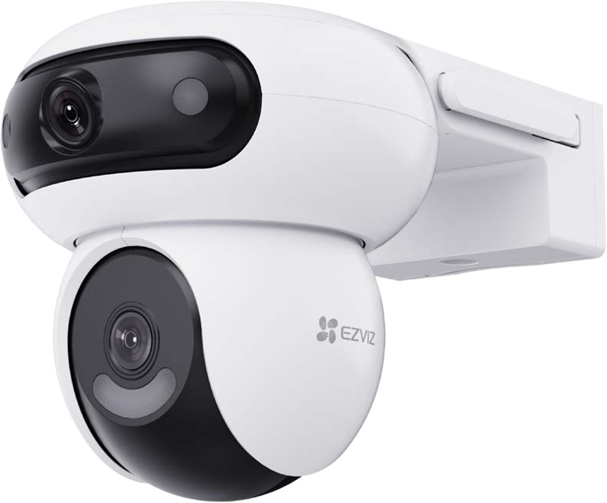 The Ezviz IP PT dual Wi-Fi camera H90 Dual features (2) 4MP sensors (2560 x 1440 px), IP65 weather protection, combined IR/white light illumination for night vision up to 30m + flasher (strobe light and audible alarm) and two-way audio. The Bullet sensor has a fixed 2.8mm (96°) lens and the PTZ sensor has a fixed 6mm (52°) lens. The camera can be connected to the network via Wi-Fi 4 or the 10/100Mbps port.