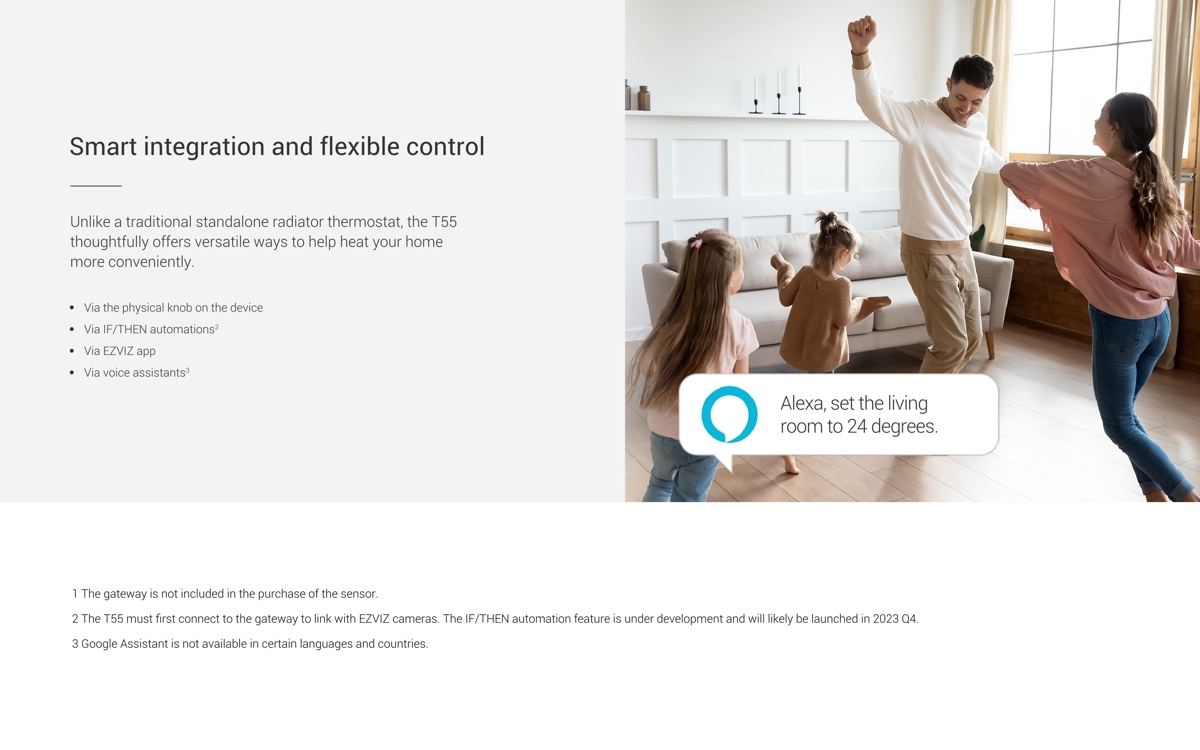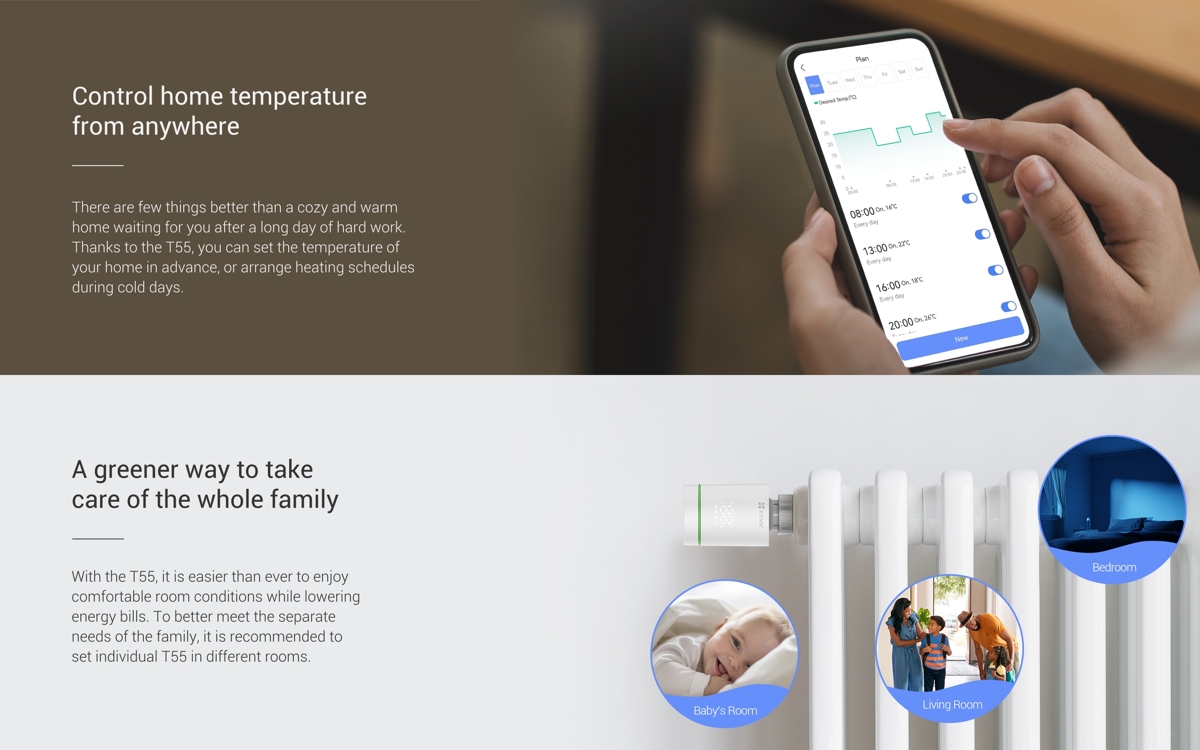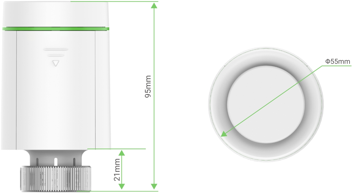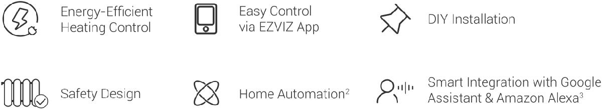 Ezviz T55 is a smart Zigbee thermostatic radiator valve that enables intelligent heating control (requires connection via the A3 home gateway). It supports automation and remote control through the EZVIZ app. It offers a child safety lock, frost protection and compatibility with Google Assistant and Amazon Alexa for voice control.
