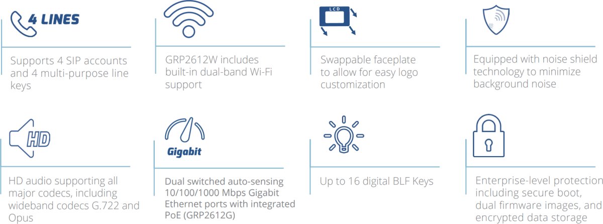 The GRP2612 is a powerful 4-line carrier-grade IP phone designed with zero-touch provisioning for mass deployment and easy management. It features a sleek design and a suite of next-generation features including Wi-Fi support (GRP2612W), 16 virtual multi-purpose keys (VPKs), a color LCD with swappable face plates for easy logo customization and more. The GRP series includes carrier-grade security features to provide enterpriselevel security, including secure boot, dual firmware images and encrypted data storage. For cloud provisioning and centralized management, the GRP2612 is supported by Grandstream’s Device Management System (GDMS), which provides a centralized interface to configure, provision, manage and monitor deployments of Grandstream endpoints. Built for the needs of desktop workers and designed for easy deployment by enterprises, service providers and other high-volume markets, the GRP2612 offers an easy-to-use and easy-todeploy voice endpoint.