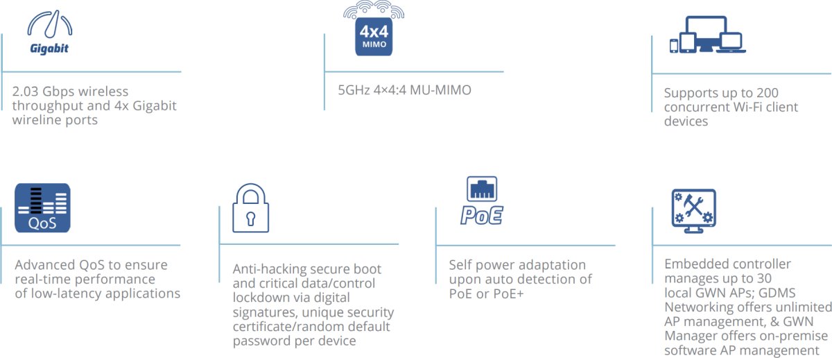 The GWN7624 is an in-wall Wi-Fi access point that includes three Gigabit network ports, 2 which provide PoE, to provide internet connections and power for devices such as IP phones, computers, TVs and more.
