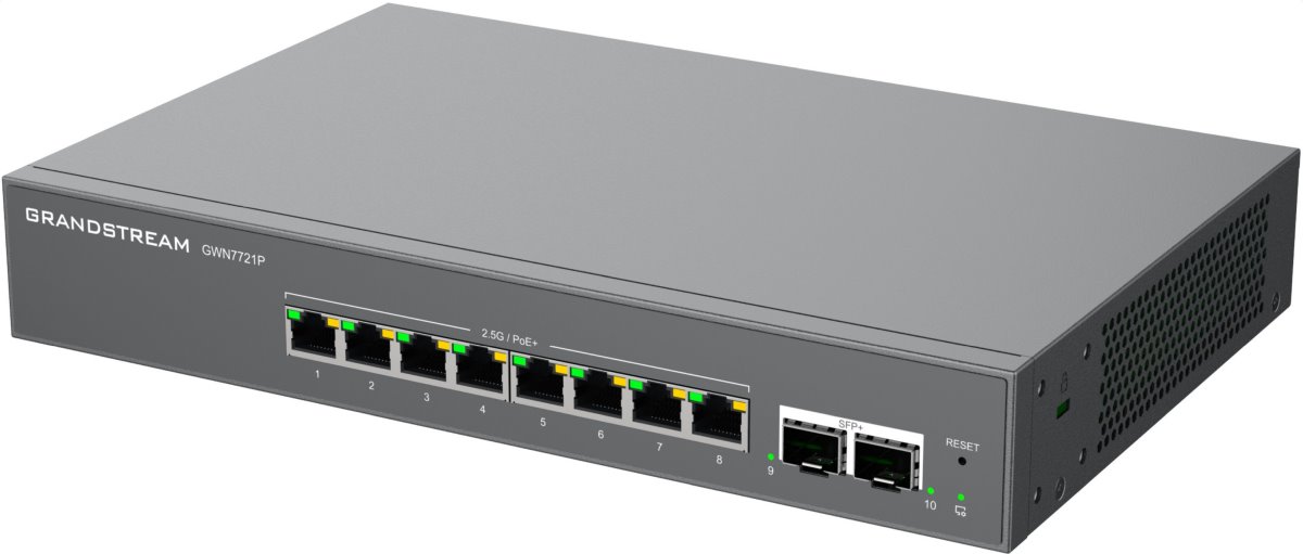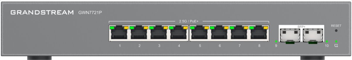 The GWN7721 and GWN7721P are 10-port Layer 2 Lite Managed Switches equipped with 8 2.5-Gigabit Ethernet ports and 2 10-Gigabit SFP+ ports to allow small-to-medium businesses to build scalable and secure high-speed networks.