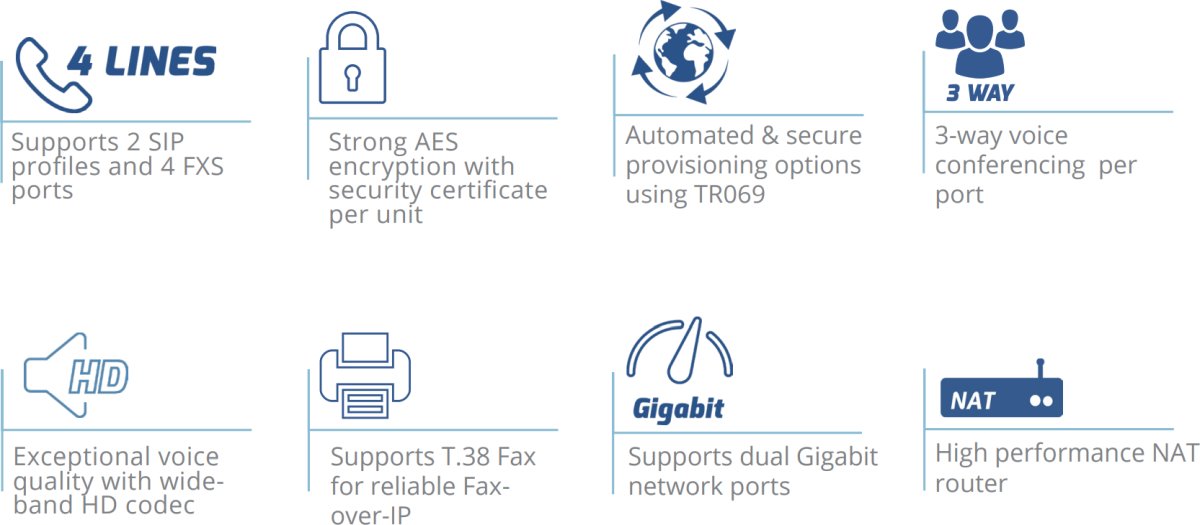 The HT814 is an advanced 4-port VoIP gateway with 4 FXS ports and an integrated Gigabit NAT router.