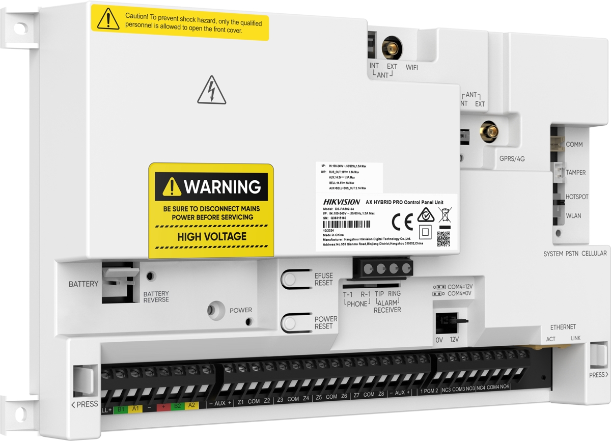 Hikvision DS-PA502-96 je ústředna pro zabezpečovací systémy AX HYBRID PRO, která podporuje až 96 zón, 96 výstupů a 48 oblastí, s možností připojit až 48 sběrnicových zařízení na každý ze dvou RS-485 sběrnicových portů. Komunikace s pultem centrální ochrany (PCO / ARC) je zajištěna několika způsoby - přes Ethernet, Wi-Fi a volitelně i PSTN, GPRS či 4G, což umožňuje vytvořit záložní komunikační kanály pro případ výpadku spojení.