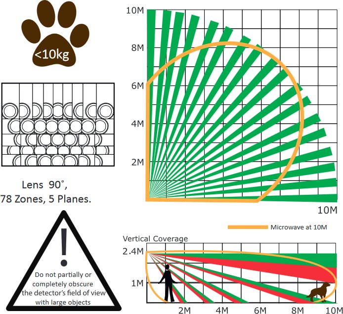 DS-PD2-T10AME-EH je venkovní kabelový duální detektor s detekcí pohybu (2x PIR) typu vějíř a mikrovln (24 GHz) na vzdálenost až 10 m, úhlem 90° a detekcí pohybu 0,25m/s až 2,5m/s z řady AX PRO od společnosti Hikvision. Detektor komunikuje s ústřednou pomocí kabelu.