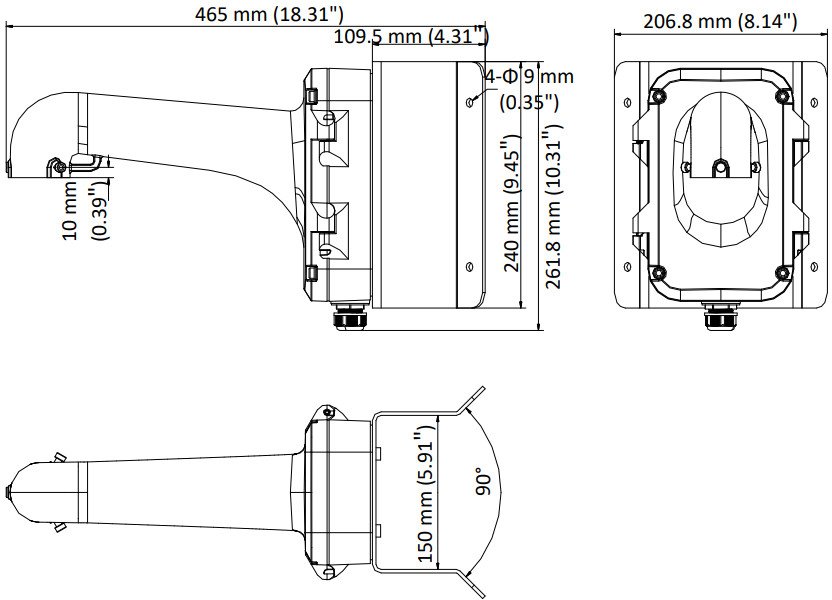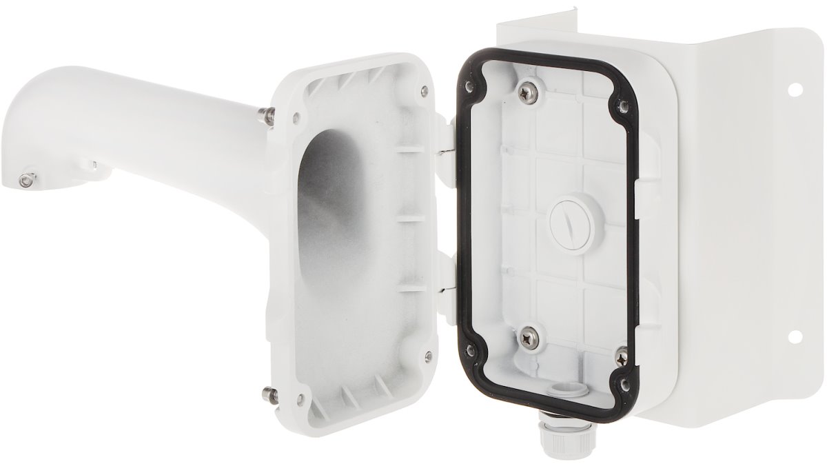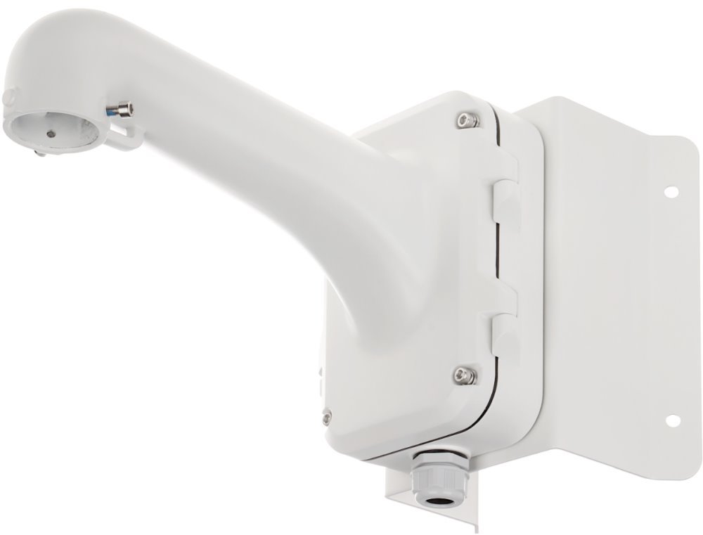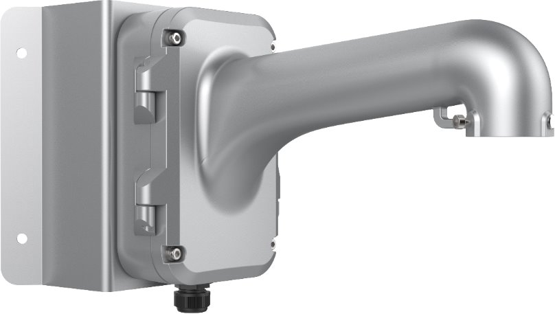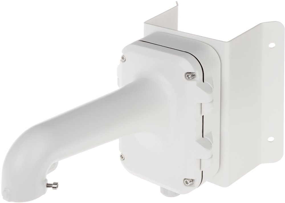 Držák od značky Hikvision DS-1604ZJ-corner-P je určený pro Speed dome a vybrané PTZ kamery s propojovacím boxem pro umístění na vnější roh. Držák je vyroben z hliníkové slitiny a ocely s povrchovou úpravou pro venkovní použití a je pokryt platinově šedou barvou. Propojovací box má na spodní straně jednu kabelovou průchodku pro vývod kabelů a na zadní straně připravený otvor pro další případnou průchodku.