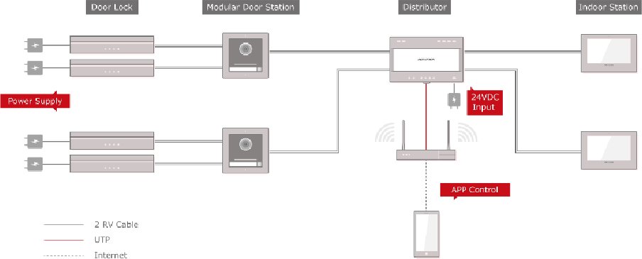 Snadno instalovatelný a konfigurovatelný kit vhodný pro domácnosti i malé firmy. Můžete použít stávající dvoužilovou kabeláž. Mobilní aplikace HIKCONNECT Vám umožní komunikovat s dveřní stanicí a přijímat videohovory kdykoli a kdekoliv (v případě zapojení řídící jednotky k routeru). Podporuje živý náhled až 16 IP kamer (ONVIF compatible).