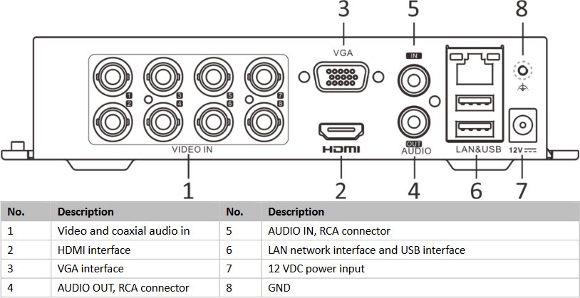 Uvnitř zařízení je místo pro 1 HDD s maximální kapacitou 10TB / disk. Do sítě se zařízení připojuje jedním LAN portem s rychlostí 10/100 Mbps, pro připojení periferií slouží 2 USB porty a v neposlední řadě je vybaveno i 1x audio vstupem/výstupem. Pro obrazový výstup slouží 1 BNC konektor, VGA i HDMI výstup s maximálním rozlišením 1920 x 1080. Maximální spotřeba samotného rekordéru bez HDD je 12 W včetně připojených kamer.