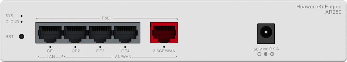 Huawei AR280 is a high-performance all-in-one gigabit PoE router with (1) 2.5G PoE+ port, (4) Gbit PoE+ ports and a 41W PoE budget. The router supports management via a local web interface as well as cloud management (eKit SNC / eKit mobile app). The device's maximum power consumption is 8W (without PoE load).