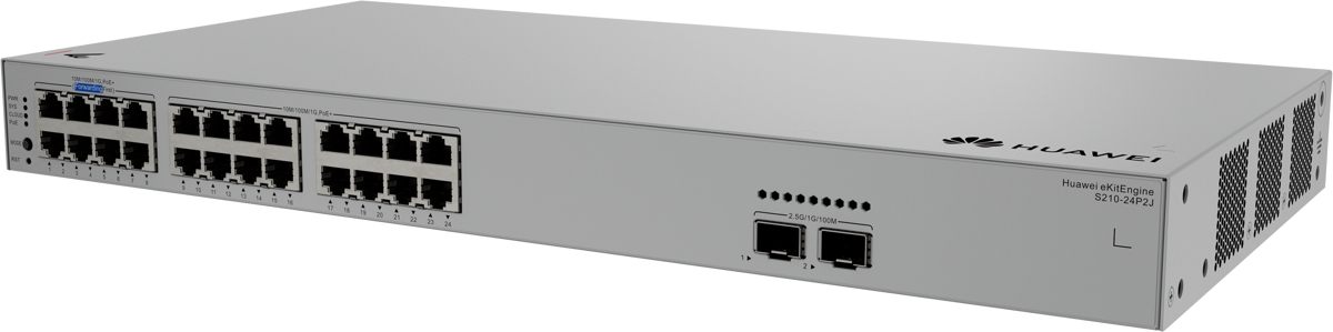 Huawei S210-24P2J je spolehlivý managovatelný cloud L2 PoE switch s kapacitou přepínání 58Gbps, (24) Gbit PoE+ porty a (2) 2.5G SFP sloty. RJ45 porty podporují PoE+ s budgetem 400W. Switch podporuje správu přes lokální webové rozhraní i cloudovou správu (eKit SNC / eKit mobilní aplikace). Maximální spotřeba energie zařízení je 32,4W (bez PoE zátěže).