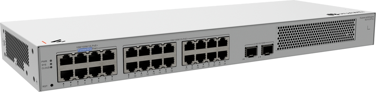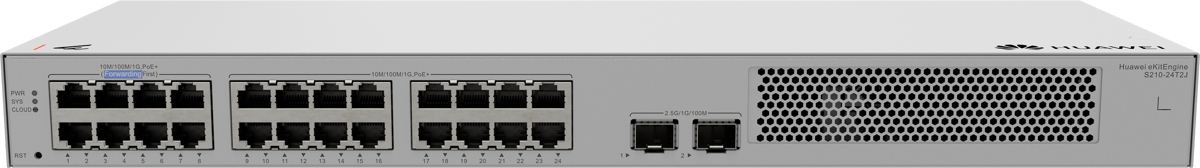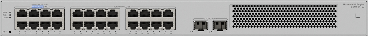 Huawei S210-24T2J je spolehlivý managovatelný cloud L2 switch s kapacitou přepínání 58Gbps, (24) Gbit porty a (2) 2.5G SFP sloty. Podporuje správu přes lokální webové rozhraní i cloudovou správu (eKit SNC / eKit mobilní aplikace). Maximální spotřeba energie zařízení je 18,9W.