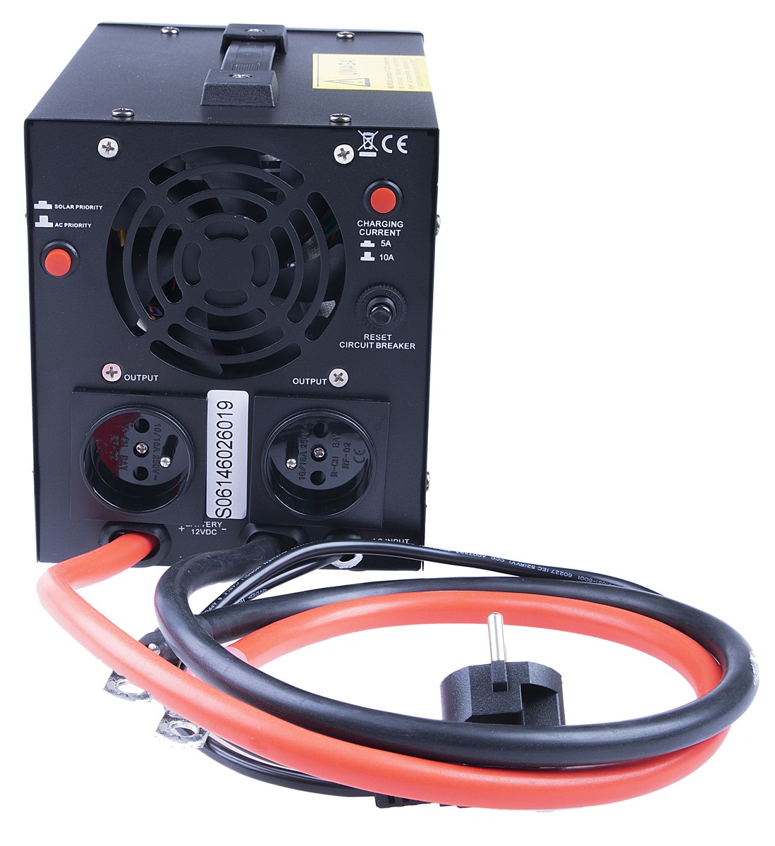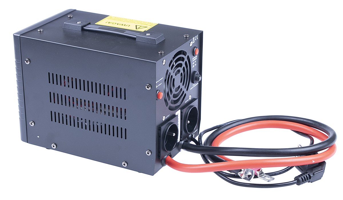 When powered from mains, the connected devices are powered by mains voltage and the external battery is recharged. In the event of a power failure, the voltage inverter is activated, the power is supplied from the battery and the devices are powered by the inverter. After restoring the mains voltage automatically switches back to the network and starts charging the battery.