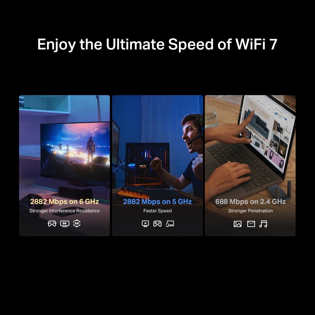 • Tri-Band Wi-Fi Speed – Speeds up to 2882 Mbps (6 GHz) + up to 2882 Mbps (5 GHz) and up to 668 Mbps (2.4 GHz).