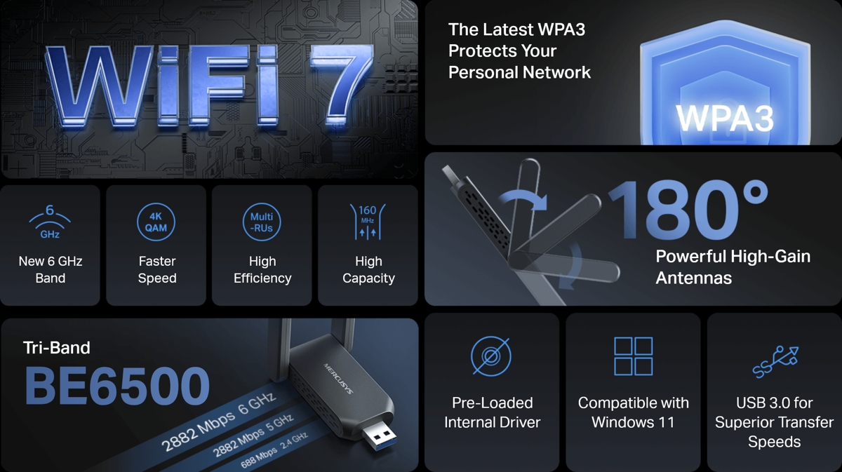 • Backward Compatibility — Full support for 802.11be/ax/ac/a/b/g/n Wi-Fi standards.