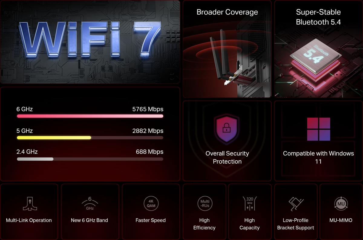 The MERCUSYS MA47BE equips your computer with Wi-Fi 7 technology and the 6 GHz band, allowing you to fully utilize the potential of your Wi-Fi 7 router. With high-speed Tri-band Wi-Fi, it can handle all your online activities with ease, from streaming HD videos to gaming and browsing the web. In addition, it features Bluetooth 5.4 technology for faster and more stable connections to peripherals such as headphones, keyboards, and game controllers.