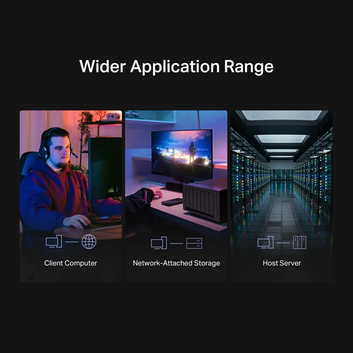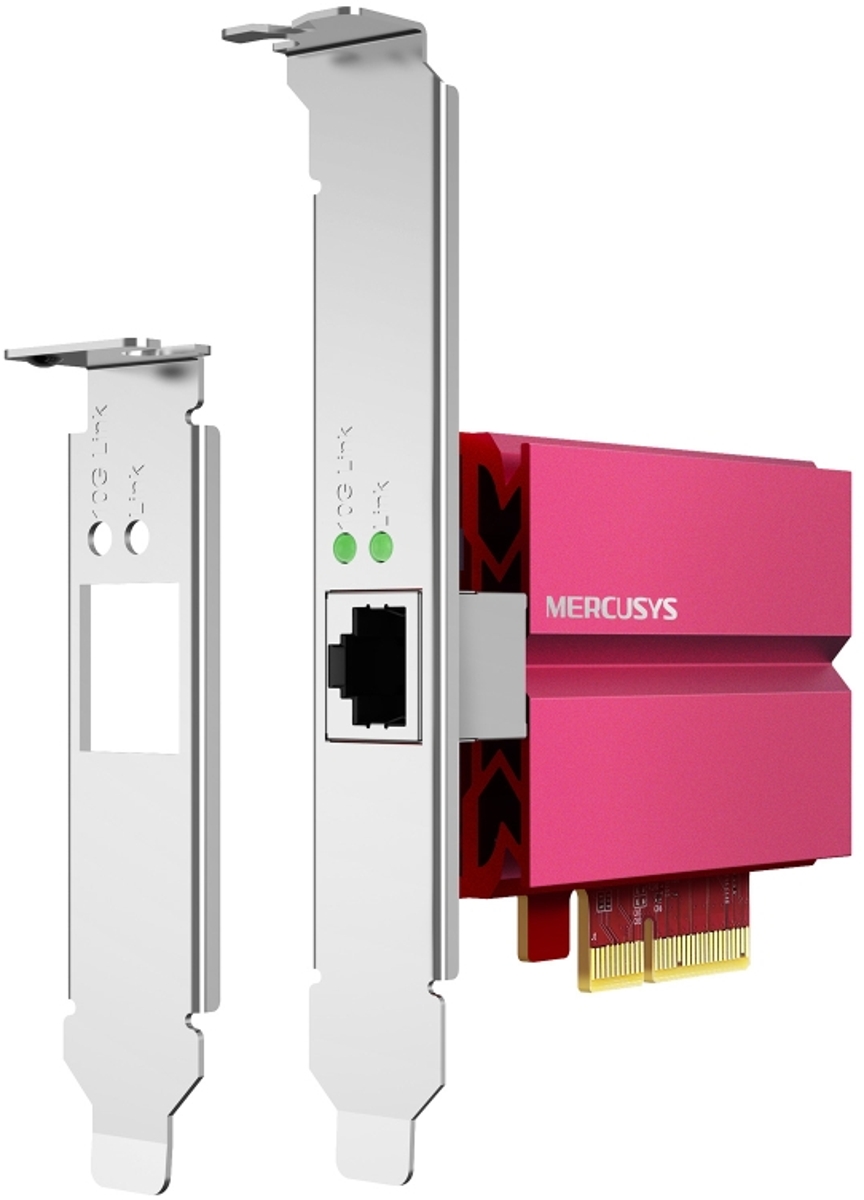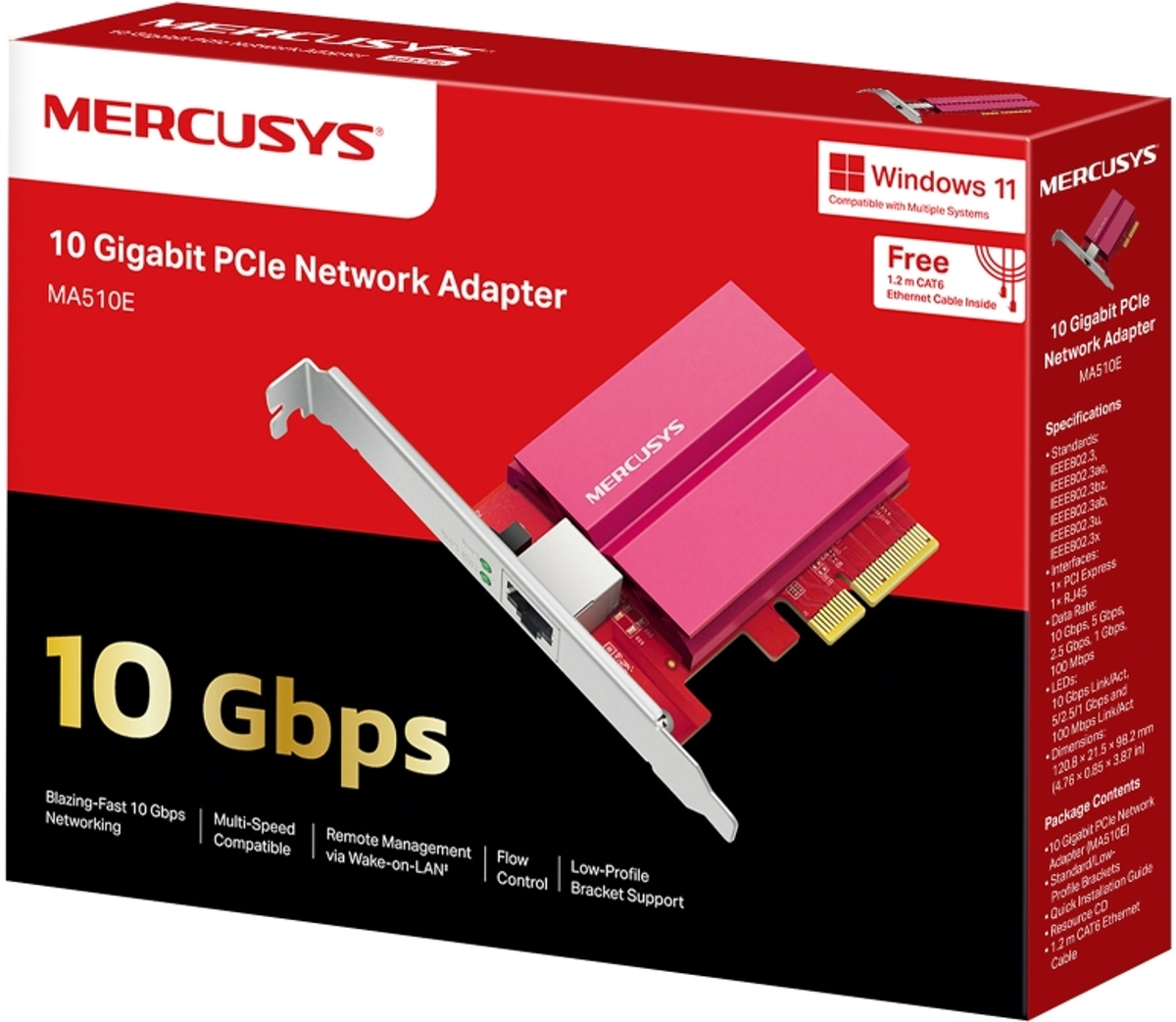 The MERCUSYS MA510E is a 10Gbps PCIe 3.0 x4 network card that equips your computer with a high-speed 10G RJ45 port.
