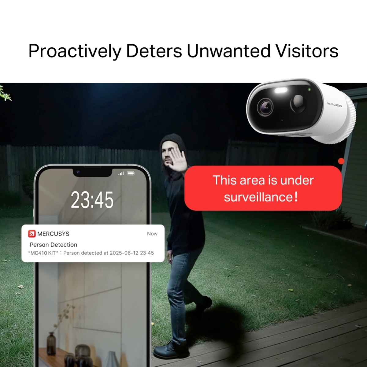 The MERCUSYS solar-powered smart wire-free bullet IP camera MC410 KIT features a 3MP sensor (2304 x 1296 px) at 15fps, a fixed 3.1mm (98°) lens, hybrid IR/white light illumination for night vision up to 12m, IP65 weather protection and two-way audio. The camera can be connected to the network via Wi-Fi 4.