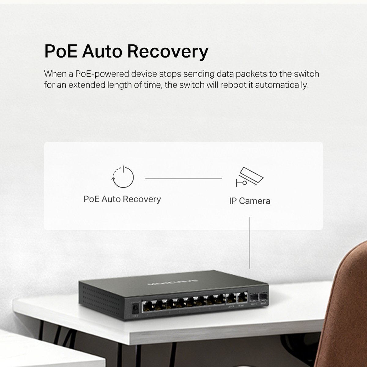 • Automatically reboots your dropped or unresponsive PoE-powered devices with PoE Auto Recovery