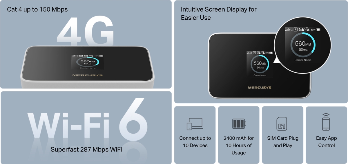 MERCUSYS MT115 is a 4G LTE router that, thanks to its compact size and built-in 2400 mAh battery, is ideal for use on the go. After inserting a SIM card, it creates a Wi-Fi 6 hotspot with download speeds of up to 150 Mbps and upload speeds of up to 50 Mbps, supporting up to 10 users simultaneously. On a single charge, it can operate for up to 10 hours, and the device can be easily managed via the MERCUSYS mobile app. In addition, it features an intuitive display that shows all key information at a glance, making it easy to track data usage and stay within your monthly data limit.