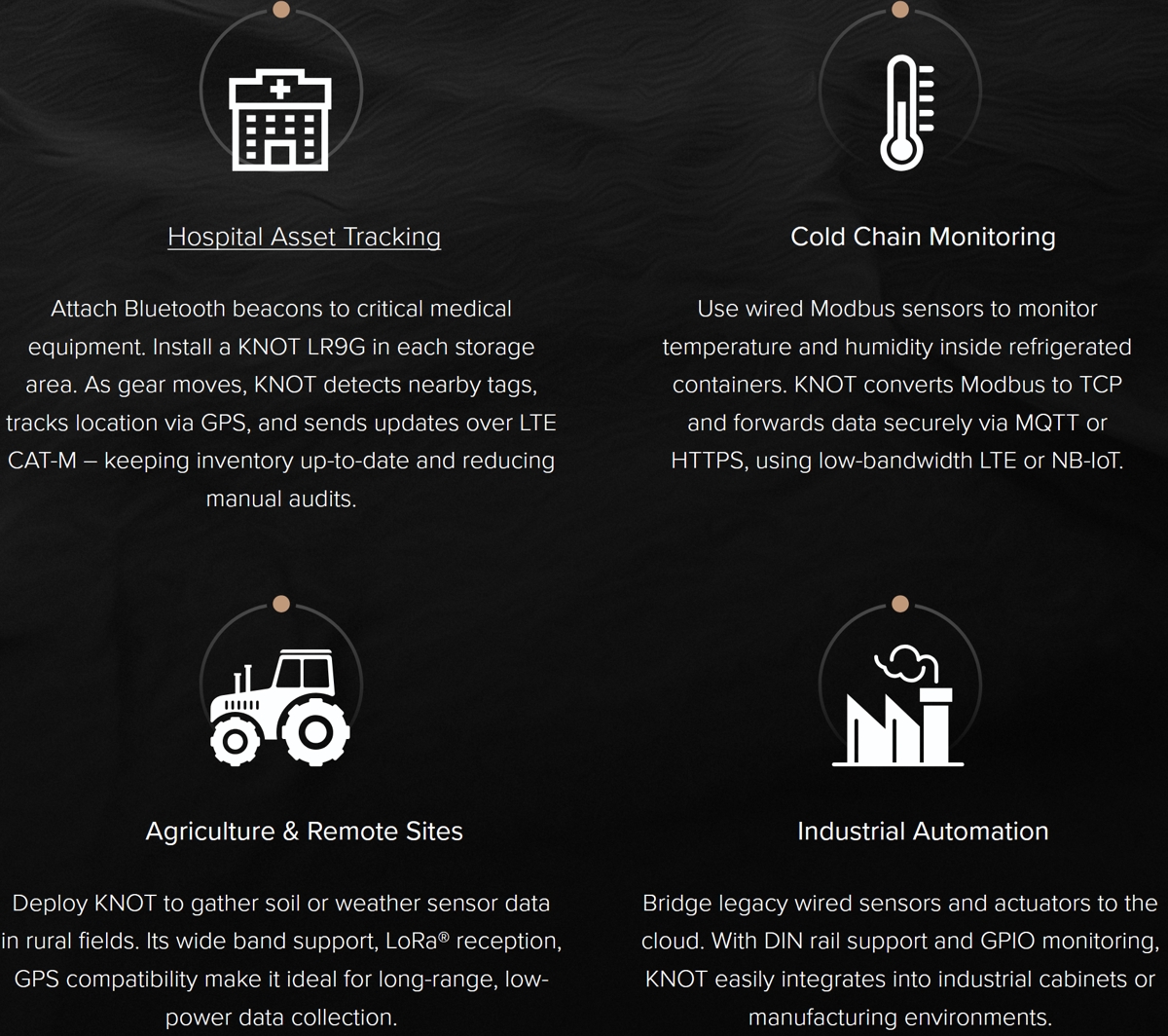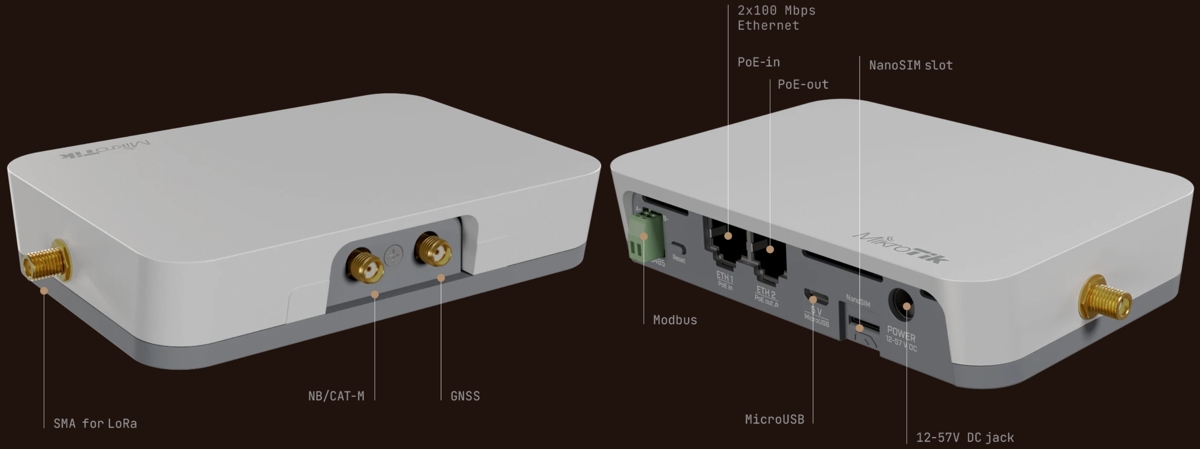 The MikroTik KNOT LR9G kit is a flexible industrial IoT gateway for asset tracking, remote monitoring, and efficient automation (Modbus and GPIO) with support for LoRa 915MHz, LTE Cat. M1 (LTE-M), LTE Cat. NB2, Bluetooth, Wi-Fi and GPS. It is equipped with (2) 10/100Mbps ports (1x PoE-In, 1x PoE-Out).