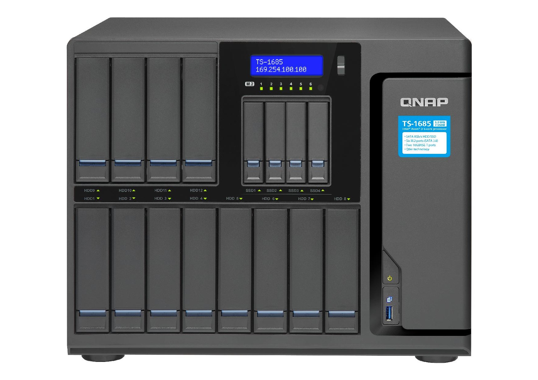 TS-1685, podporující až dvanáct HDD 3,5" a čtyři SSD 2,5", je vysokokapacitní, robustní a spolehlivý podnikový NAS založený na procesoru Intel® Xeon® D. TS-1685, navržený pro optimalizace podnikové IT infrastruktury, je dodáván se třemi sloty rozhraní PCIe podporujícími karty rozhraní sítí 10GbE/40GbE, SSD PCIe NVMe, grafické karty a rozšiřující karty rozhraní USB 3.1. TS-1685, nabízející integrované zabezpečení a škálovatelnost, představuje ideální volbu pro kompletní úložné řešení připravené k podnikání se sdílením souborů napříč platformami, s rozsáhlým zálohováním a funkcí obnovení po havárii, s iSCSI a virtualizací a s mnoha dalšími podnikatelskými aplikacemi.