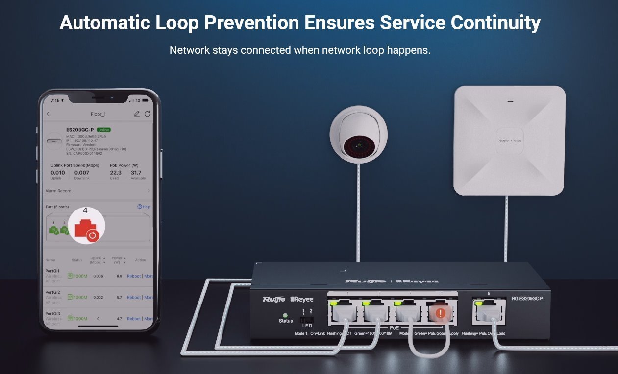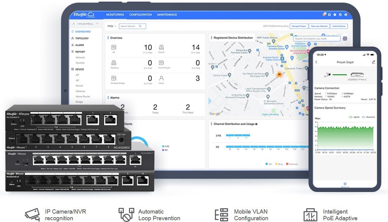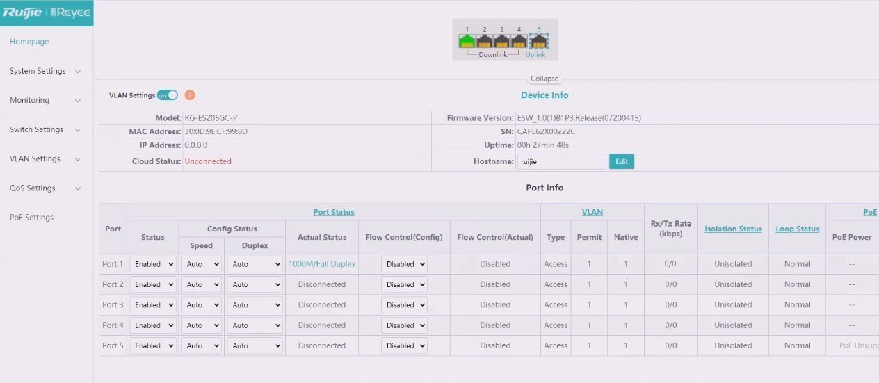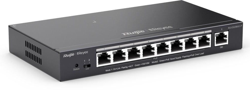 Cloud and web interface manageable smart desktop PoE switch RG-ES209GC-P from Ruijie , offers a cost-effective solution with 9 Gigabit LAN ports of which 8 ports support 802.3af/at PoE with a total PoE budget 120 W. This compact switch is ideal for network applications that require performance and reliability. As for the list of functions, the switch offers silent operation without fans, support for up to 16 VLANs, DHCP snooping, cable testing, protection against looping and, within PoE, the possibility of using up to a distance 250 m when the line speed is reduced to 10 Mbps.