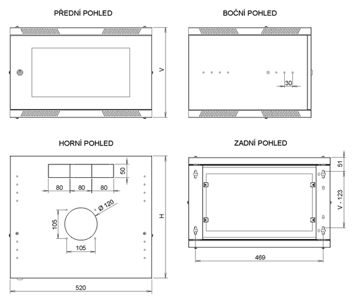- připravené vstupy pro kabeláž ve stropě, dně i na bočních stranách skříně formou vylamovacích otvorů