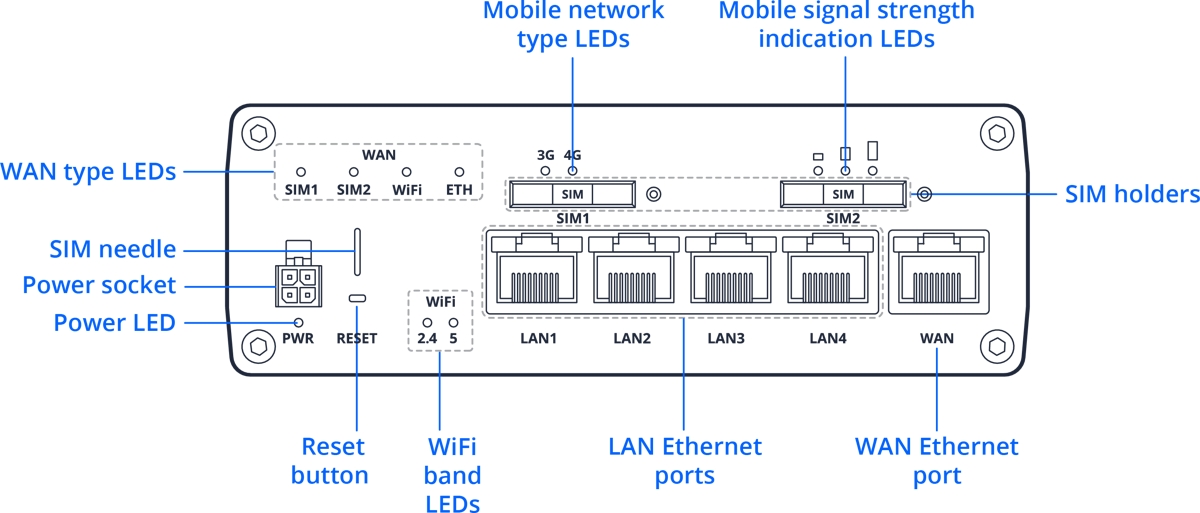 The router is equipped with a modem supporting 4G LTE Cat. 6 and 3G, with data rates of up to 300Mbps downlink and 50Mbps uplink. Power can be supplied via the 4-pin DC connector (9-50 V) or passive PoE (9-50 V) on the LAN1 port.