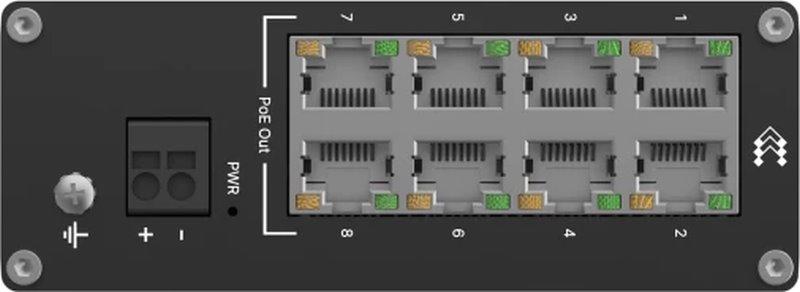 The TSW040 is an unmanaged 8-port PoE+ switch by Teltonika, featuring eight RJ45 ports with a total power budget of 240 W, or up to 30 W per port. This compact and rugged 8-port switch also features a 2-pin power input and an integrated DIN rail for easy mounting, making it ideal for industrial applications. The TSW040 has a wide voltage range of 7-57 VDC and a PoE-out voltage range of 44-57 VDC.