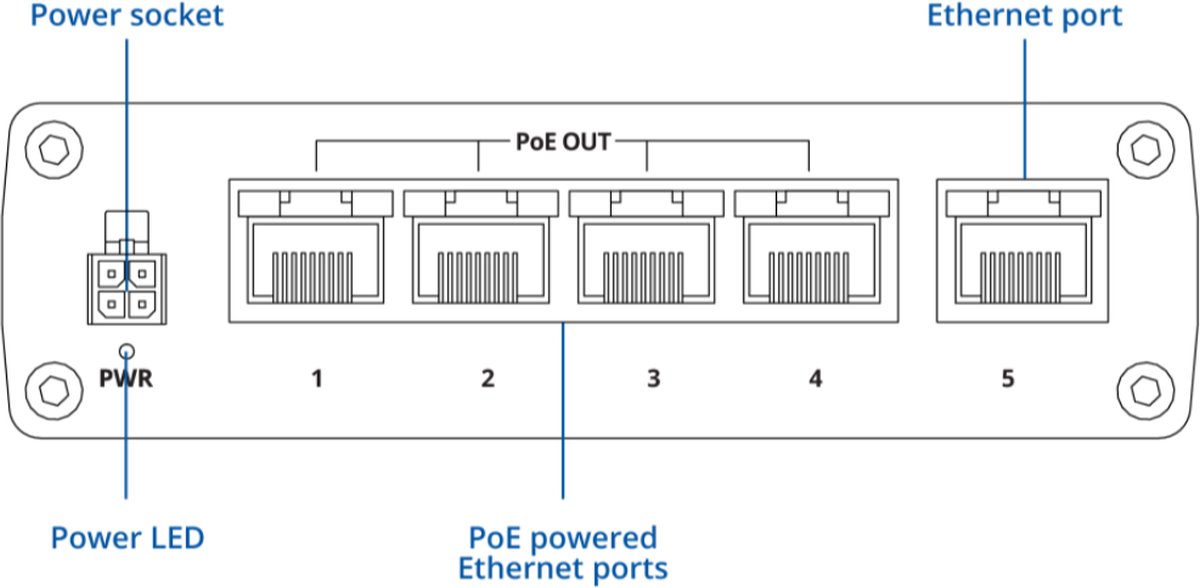 Note that TSW100 PoE ports works properly when switch is powered using PSU, which can supply 44-57 VDC. If TSW100 switch is powered with voltages ranging from 7 VDC to 43 VDC, it will work as standard switch, without PoE capabilities.