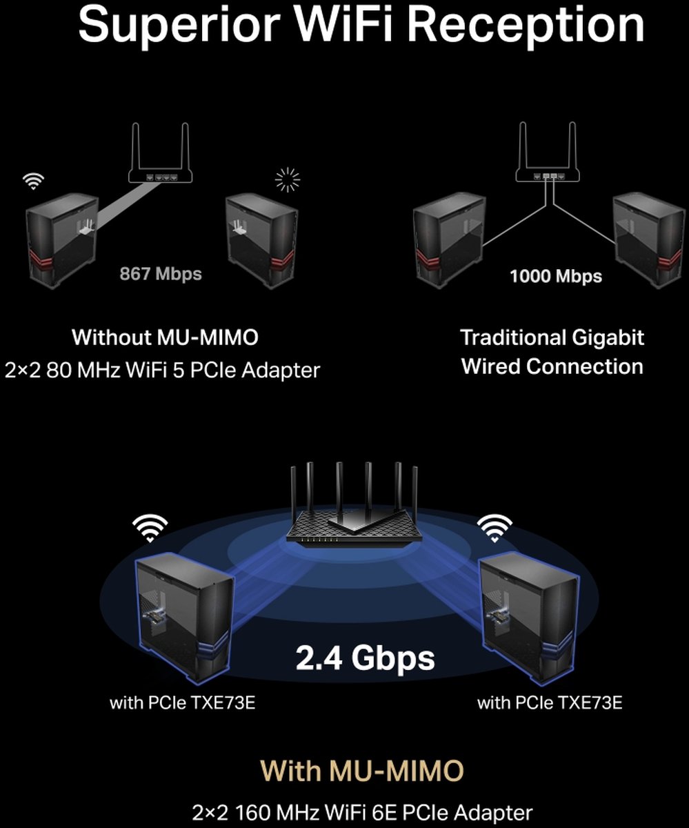Upgrade your computer with cutting-edge Wi-Fi 6E connection using the PCIe adapter TP-Link Archer TXE73E. This is a tri-band adapter with speeds up to 2402 Mbps (6 GHz) + up to 2402 Mbps (5 GHz) + up to 574 Mbps (2.4 GHz) and support for Bluetooth 5.3. Equiped with modern Wi-Fi 6E chipset from Intel supports MU-MIMO, OFDMA and the latest WPA3 encryption. Adapter is compatible with Windows 10/11*.