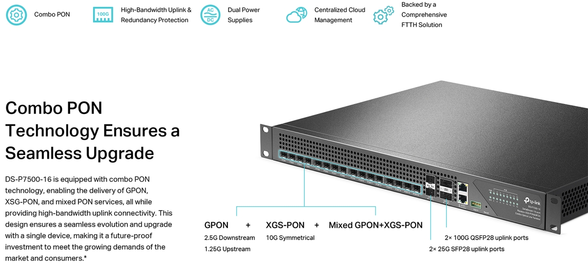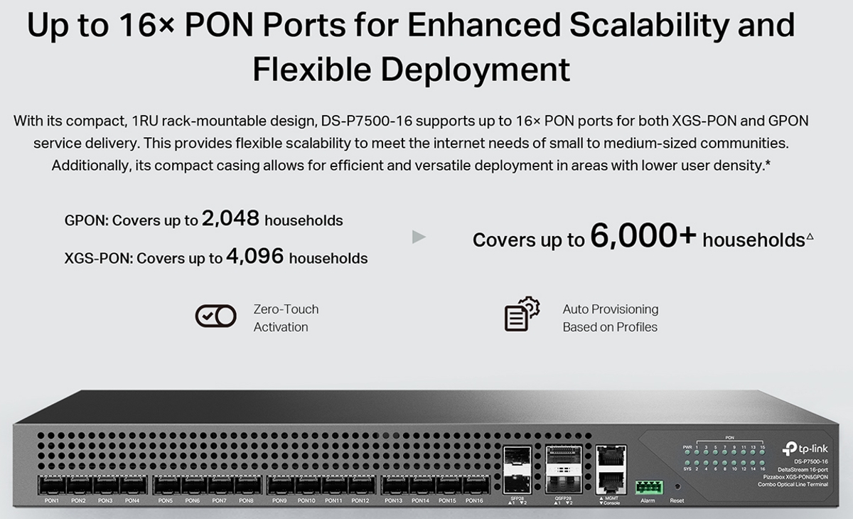 The TP-Link DS-P7500-16 is a 16-port DeltaStream Pizza-Box XGS-PON & GPON combo OLT featuring advanced L2/L2+ functions . It offers high ONU capacity, Multi-Level QoS, Zero-Touch activation, Auto Provisioning and redundant power supplies for maximum reliability.