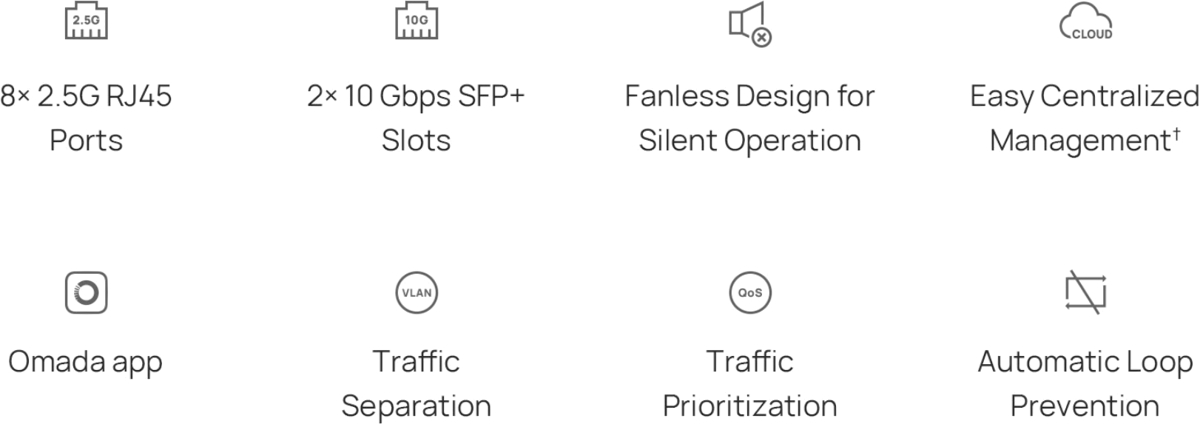 TP-Link ES210X-M2 is an Omada Easy Managed 2.5G switch with a switching capacity of 80Gbps, (8) 2.5G ports and (2) SFP+ slots. It supports management via a local web interface and cloud management. The maximum power consumption of the device is 8.4W.