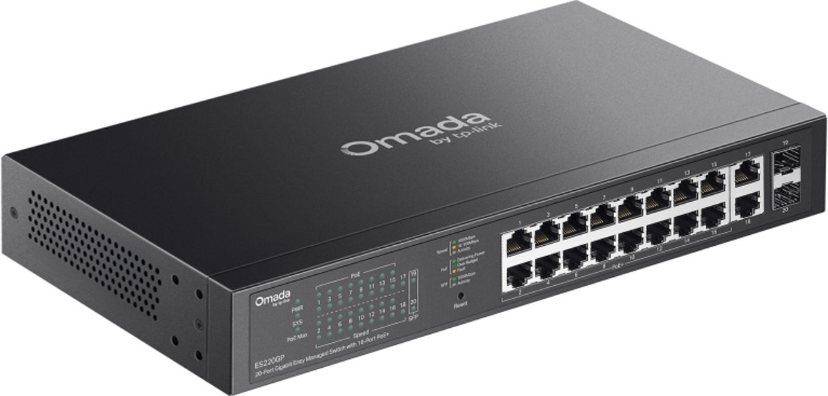 Omada ES220GP is a reliable manageable gigabit switch with a switching capacity of 40 Gbps, (16) gigabit RJ45 PoE+ ports, additional (2) gigabit RJ45 ports and (2) gigabit SFP slots. In total 16 ethernet ports support 802.3af/at PoE-Out with an output power of 30 W/port and a total PoE budget of 150W.