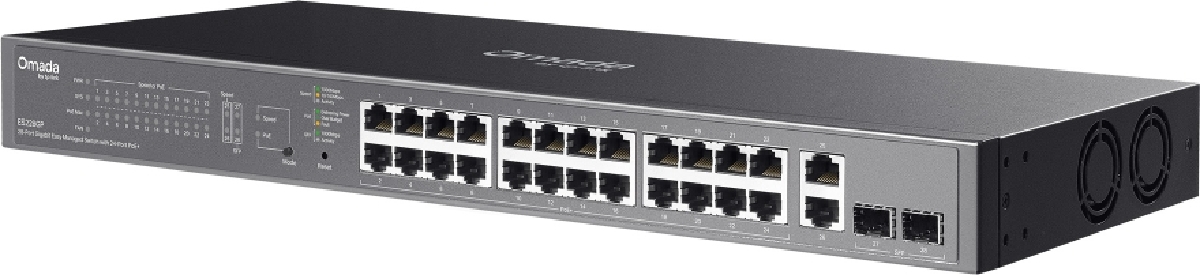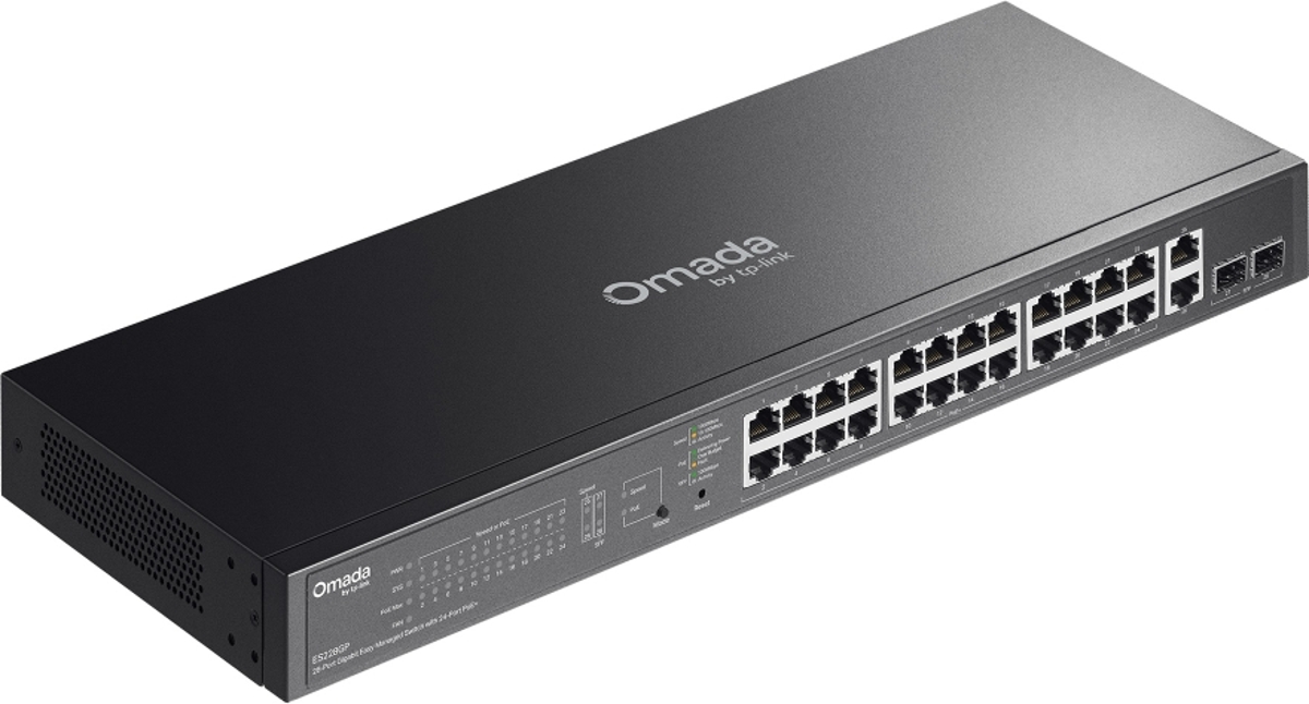 Omada ES228GP is a reliable manageable gigabit switch with a switching capacity of 56 Gbps, (24) gigabit RJ45 PoE+ ports, additional (2) gigabit RJ45 ports and (2) gigabit SFP slots. In total 24 ethernet ports support 802.3af/at PoE-Out with an output power of 30 W/port and a total PoE budget of 250W.