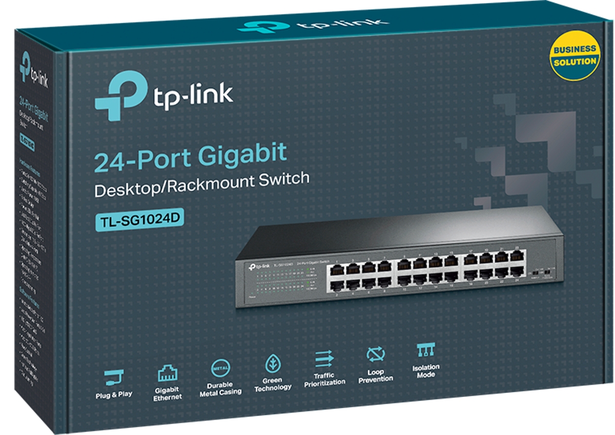 The TP-Link TL-SG1024D is a gigabit switch with a switching capacity of 48Gbps and (24) 1Gbit ports. The switch uses passive cooling, providing completely silent operation suitable for office environments. Its maximum power consumption is 13.5W.