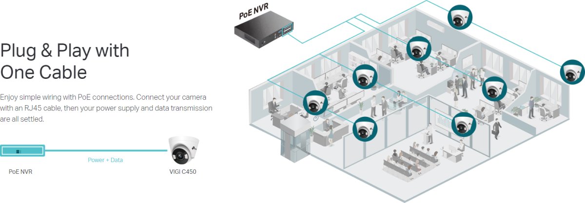 VIGI C450(4mm) is a 5 MP indoor Turret camera of the TP-Link brand with a 4 mm fixed lens, white light and IR illuminator up to a distance of 30 m and Ethernet port with PoE support. The camera has a maximum resolution of 2880 × 1620 px (at 30 fps), a viewing angle of 90°, 2 independent streams, a digital WDR sensor, two-way audio (microphone and speaker), microSD card slot, ONVIF support and the H.264 codec(+ ) including H.265(+). Thanks to its greater sensitivity, the camera supports the so-called Full-Color color image throughout the night.
