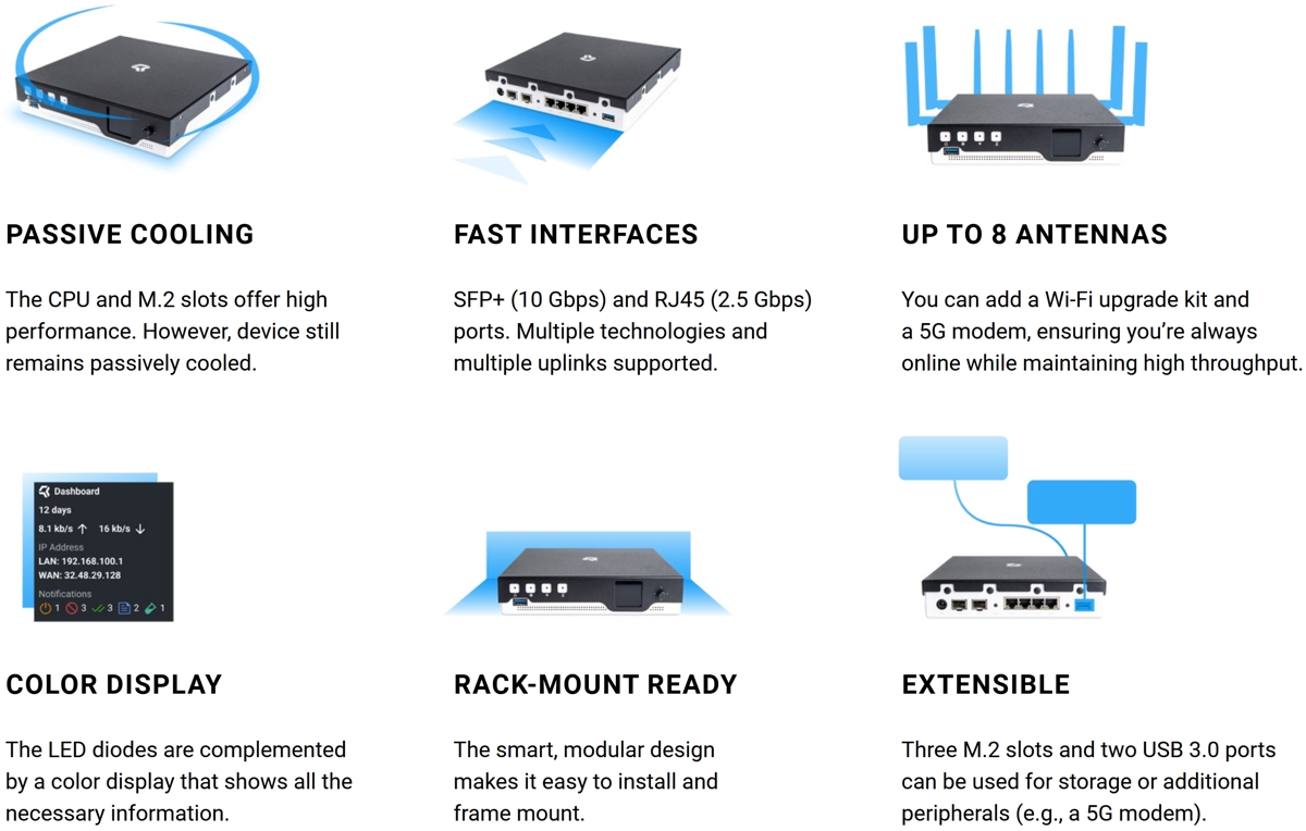 High-performance 10 Gbps, secure, open-source router with a display and extensive customization options. The WAN port is a (1) 10/100/1000/2500/10000 Mbps SFP+ port or (1) 10/100/1000/2500 Mbps RJ45 port and the local network includes (3) 10/100/1000/2500 Mbps RJ45 ports and (1) 10/100/1000/2500/10000 Mbps SFP+ port.
