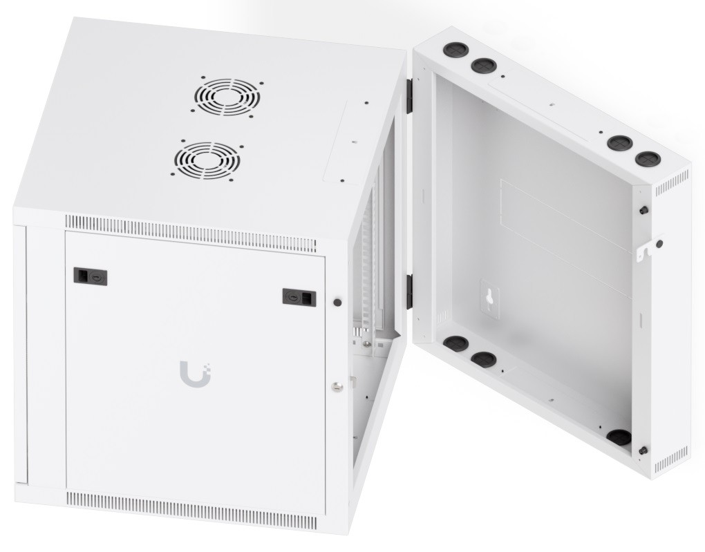 To ensure efficient cooling of active components, the rack is equipped with a pair of fans, keeping total noise levels below 50 dB(A). If you need to back up active devices using, for example, batteries, you will appreciate its above-standard load capacity of 80 kg. The enclosure features an elegant white finish with a powder-coated surface, and the Ubiquiti logo is present on the side panels. Cable entry points covered with blanking plates are available on the bottom, top, and rear sides of the rack.