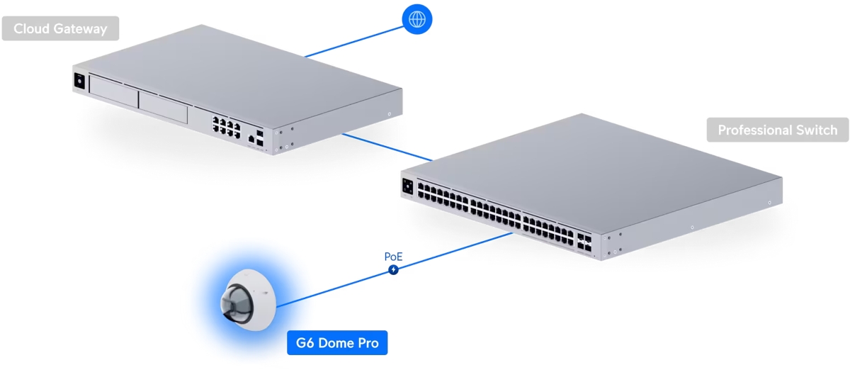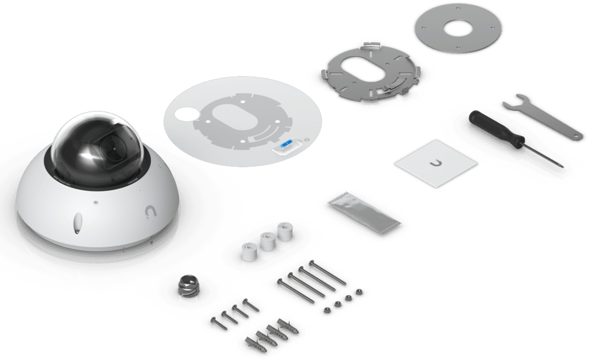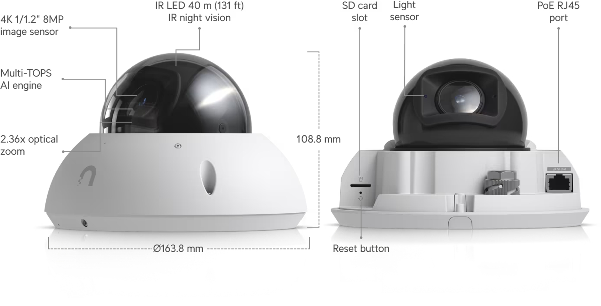 Ubiquiti G6 Pro Dome features an 8MP sensor (3840 x 2160px) at 30 fps, a varifocal lens (2.36x optical zoom), and adaptive IR illumination for night vision up to 40 meters. The camera has a durable housing made of aluminum and polycarbonate, with IP66 protection against dust and powerful water jets. It connects to the network via Gigabit LAN with PoE+ support and a maximum power consumption of 15W.