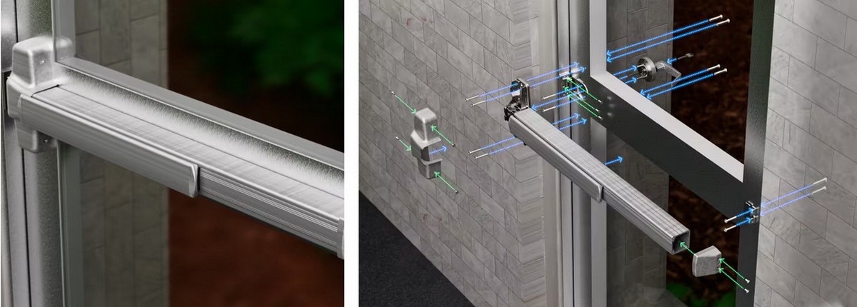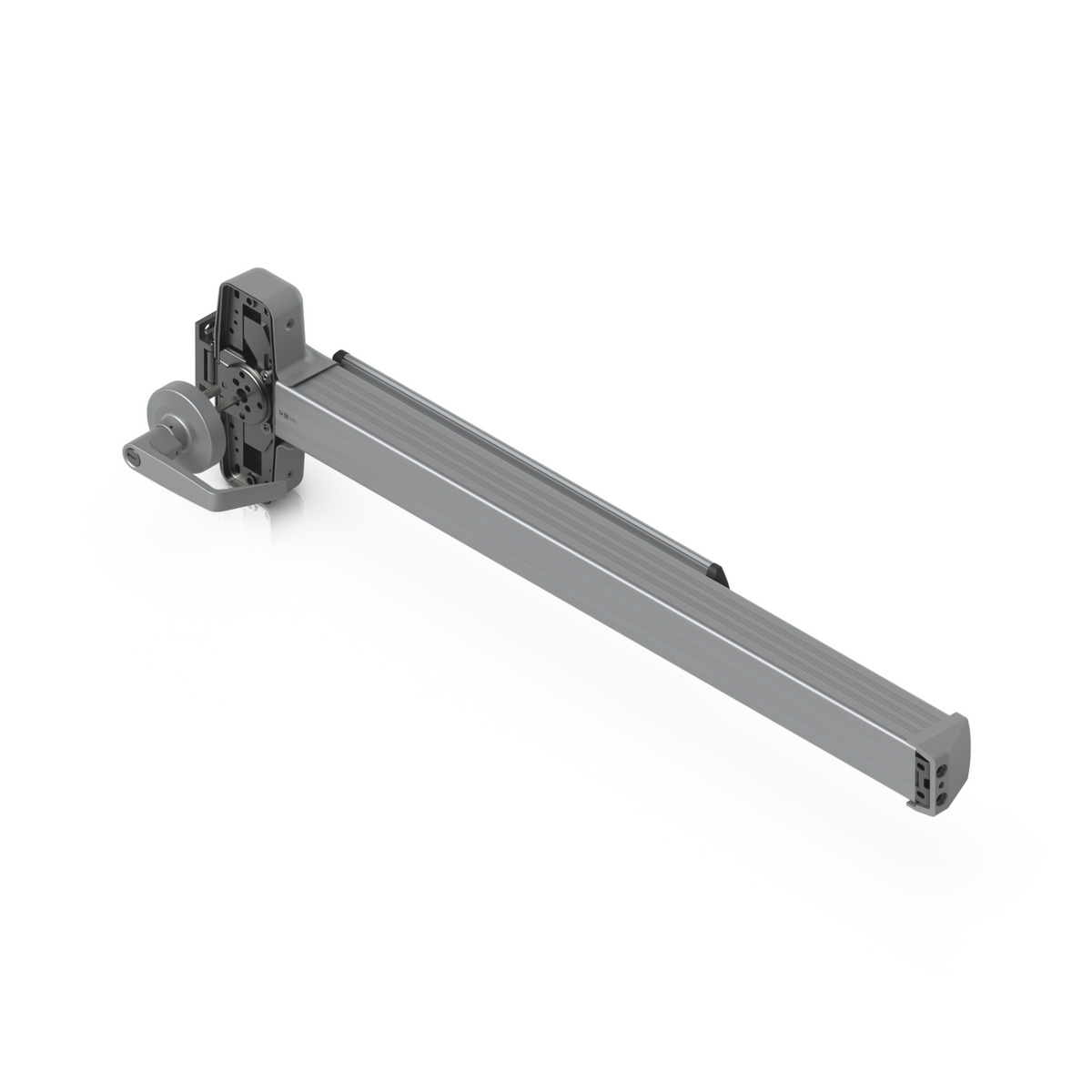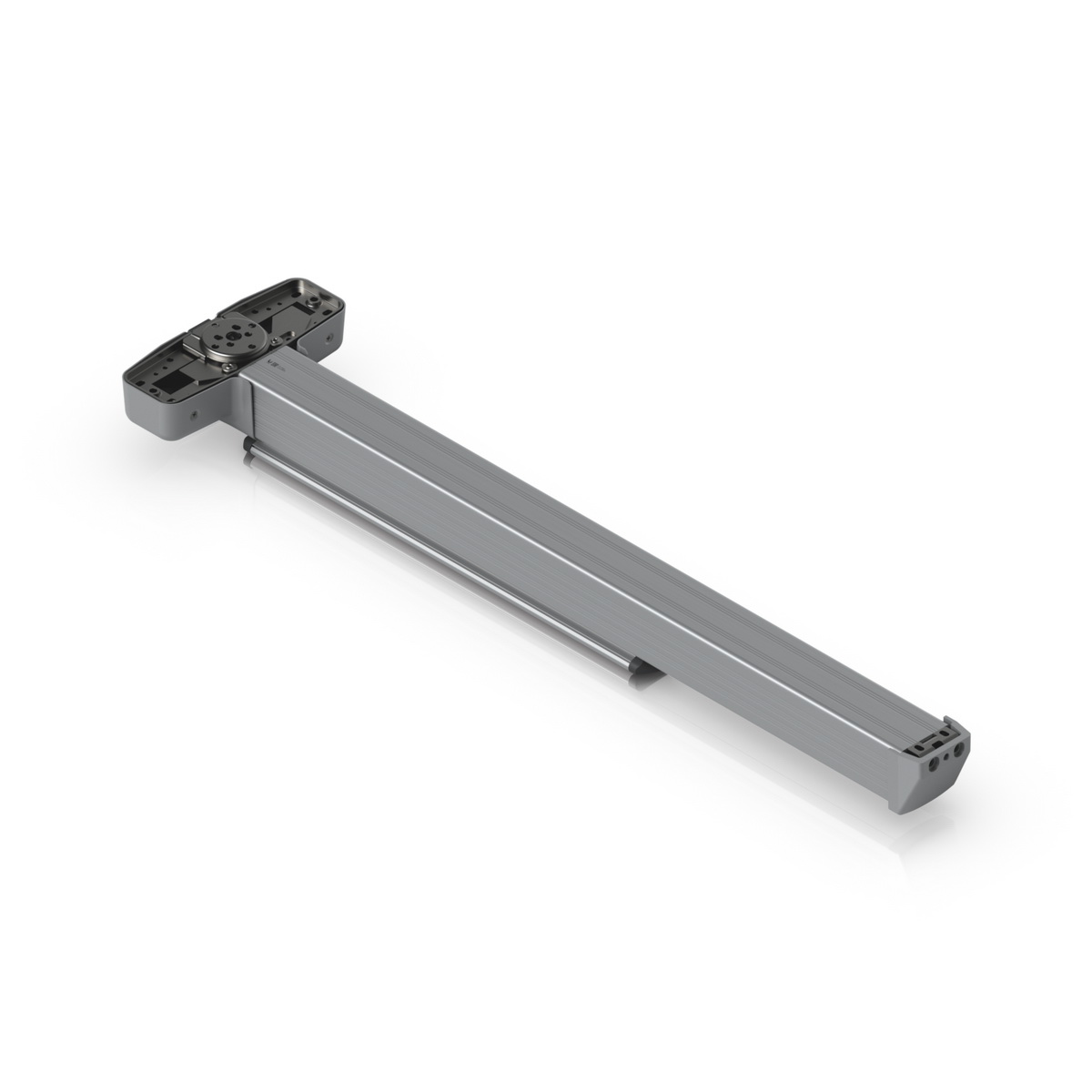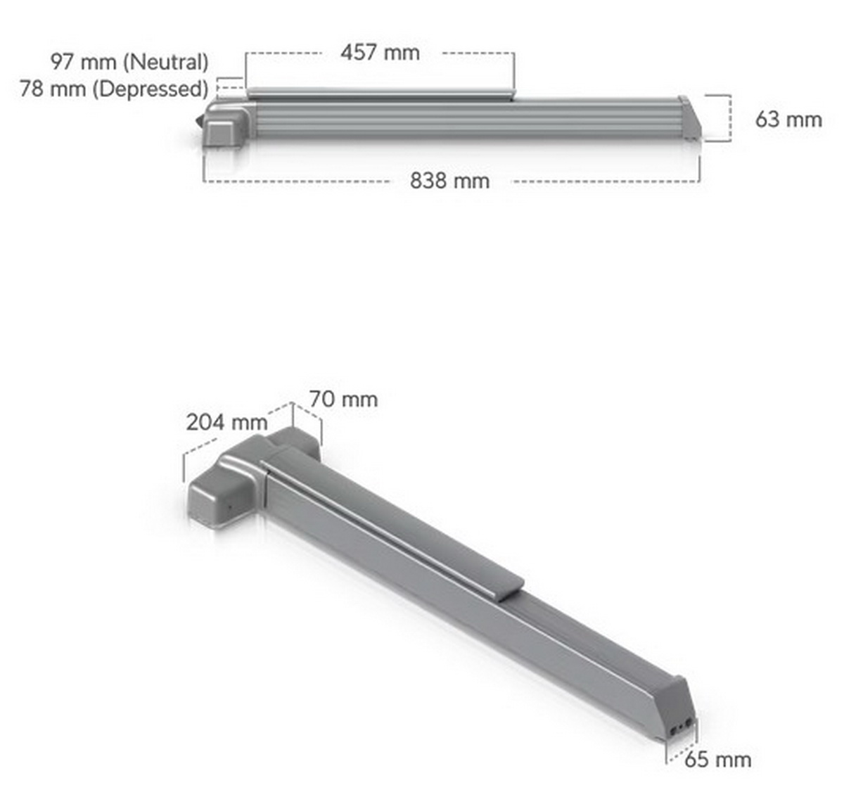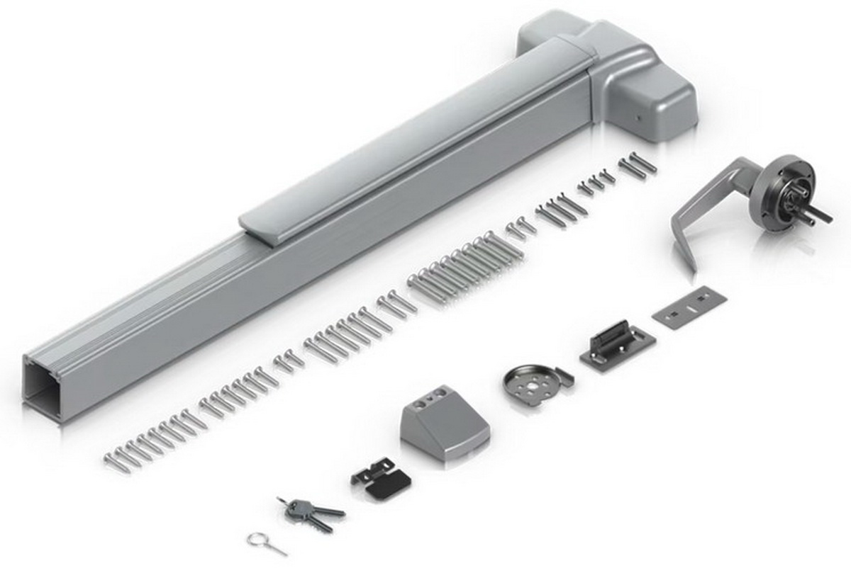 The UACC-PanicBar door panic hardware allows safe and quick evacuation of a building in case of an emergency. The bar is equipped with a switching relay with contact rating 30 V DC / 1 A. When the bar is pressed, the relay closes; when it is released, the relay opens.