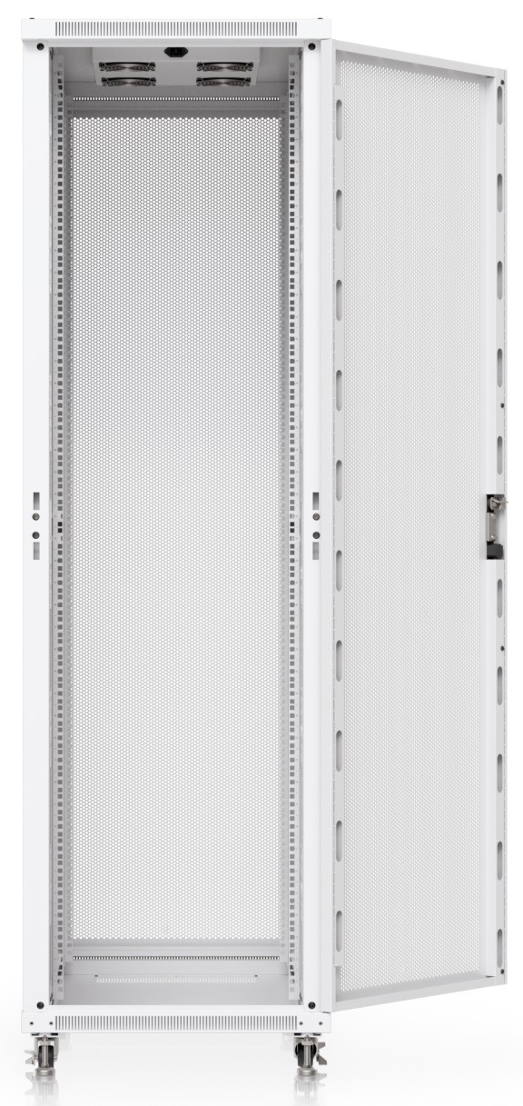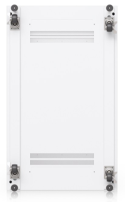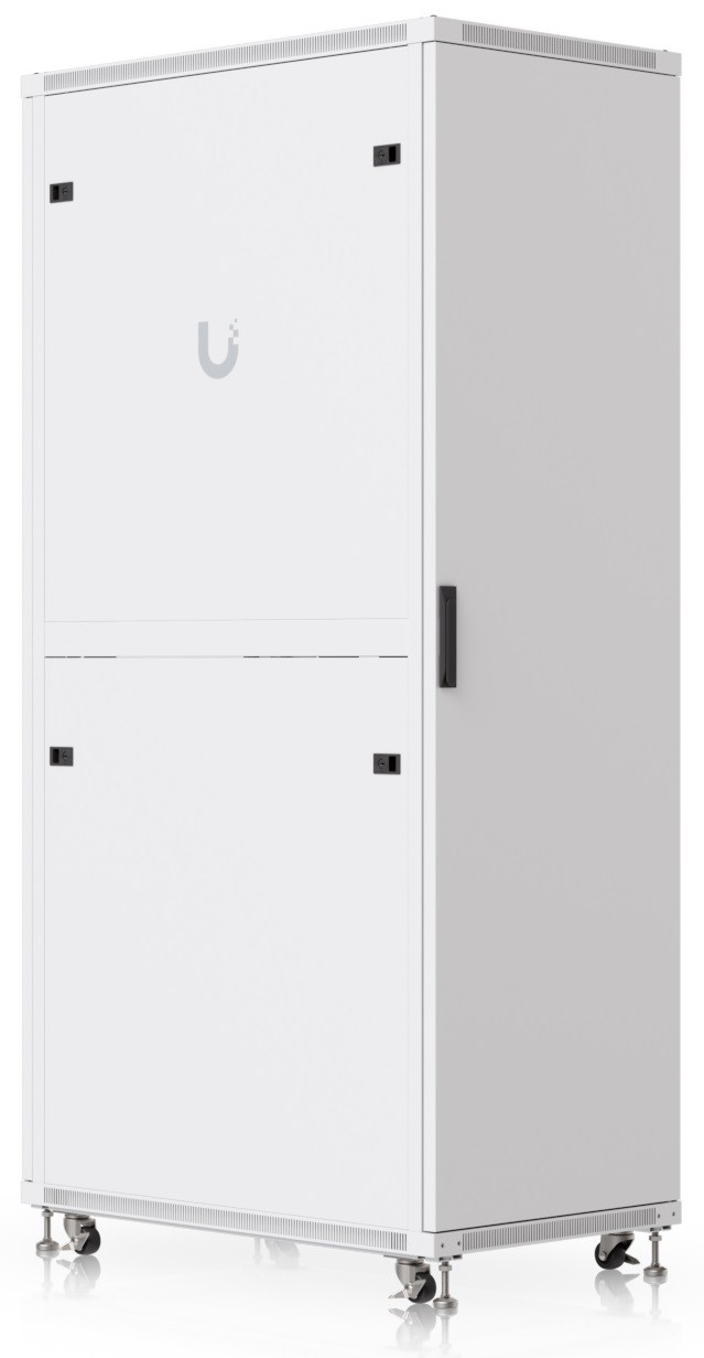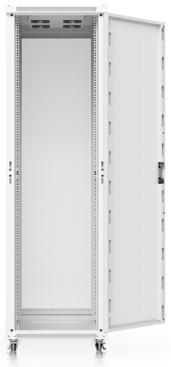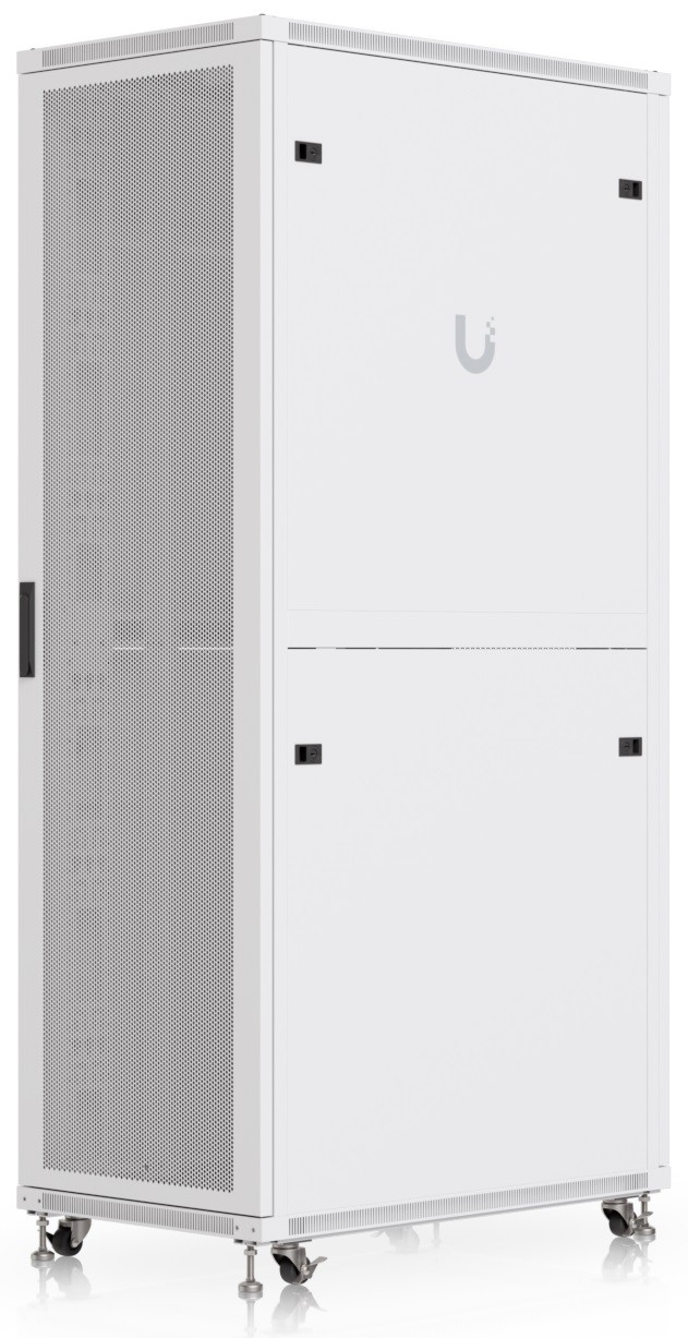 Ubiquiti UACC-Rack-42U-1000-P is a 19" floor-standing rack in 42U size, delivered fully assembled and equipped with a perforated front and back door panel, which — just like the split removable side panels — can be locked to prevent unauthorized access. The door is factory-set to a left-hand orientation with the option to reverse it. With a depth of 1000 mm, the rack allows the installation of networking devices up to 877 mm deep.