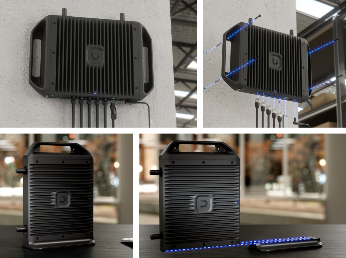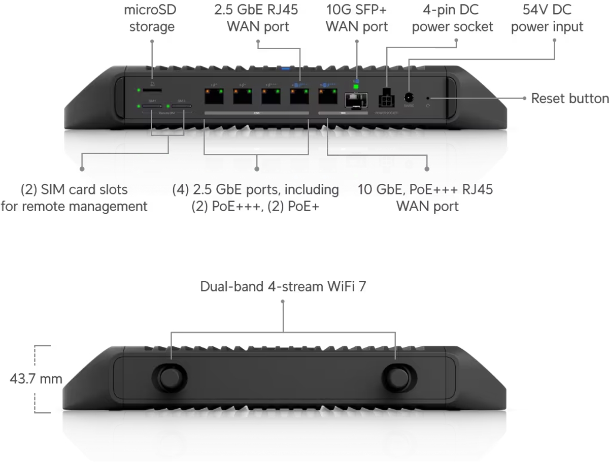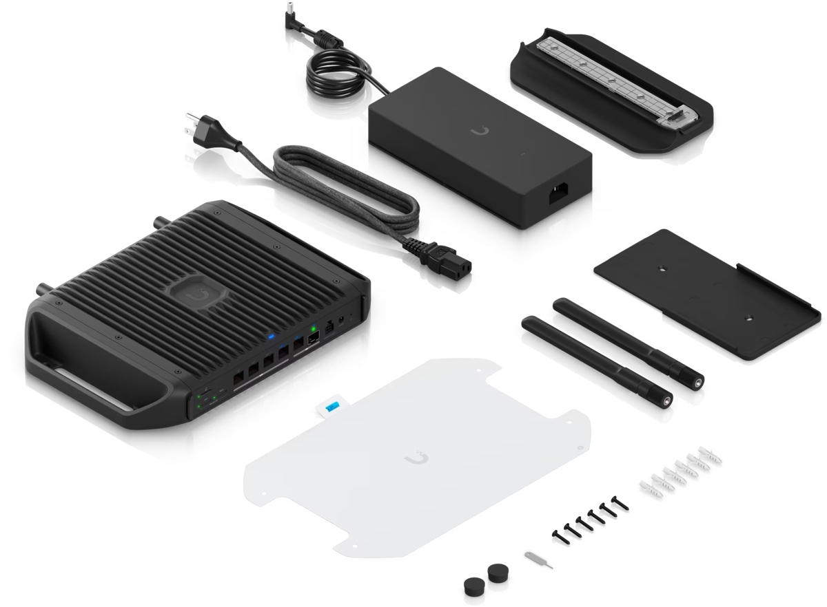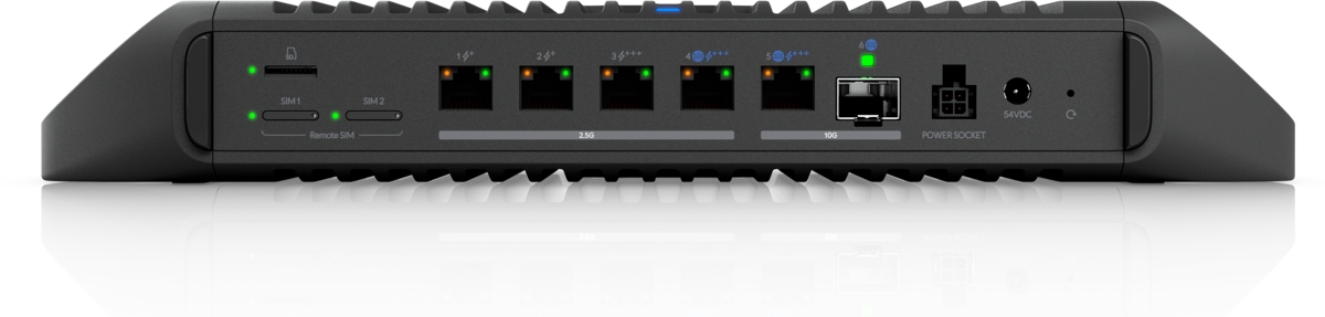 The Ubiquiti Cloud Gateway Industrial is an industrial UniFi dual-band Wi-Fi 7 router operating simultaneously in the 2.4GHz and 5GHz bands to achieve a total throughput of up to 4.99Gbps. It is further equipped with (1) SFP+ slot, (1) 10G port, (4) 2.5G ports, (1) microSD slot for camera recording (preinstalled 128GB card) and (2) SIM slots for use with U5G-Max-Outdoor.