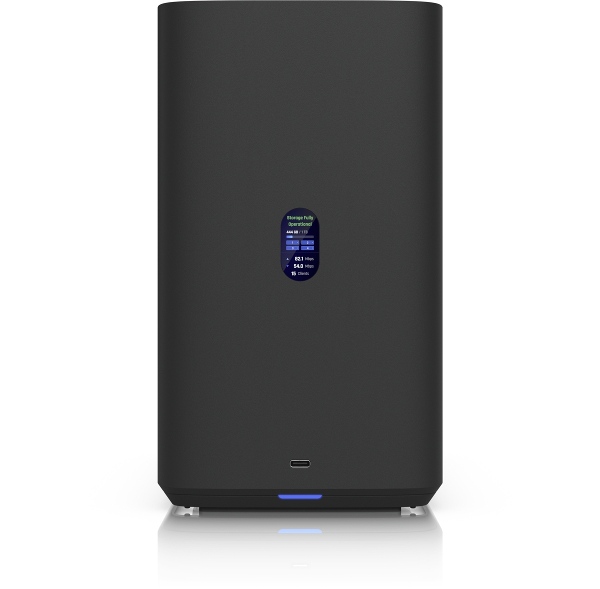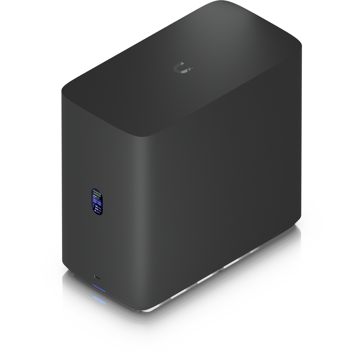 UniFi Network Attached Storage with (4) 2.5/3.5" HDD bays, (2) M.2 NVMe SSD cache slots, 2.5 GbE RJ-45 networking, USB-C connectivity, and an included PoE+++ adapter, all in a compact footprint. Powered by a quad-core ARM Cortex-A55 processor, complemented by 4 GB of RAM.