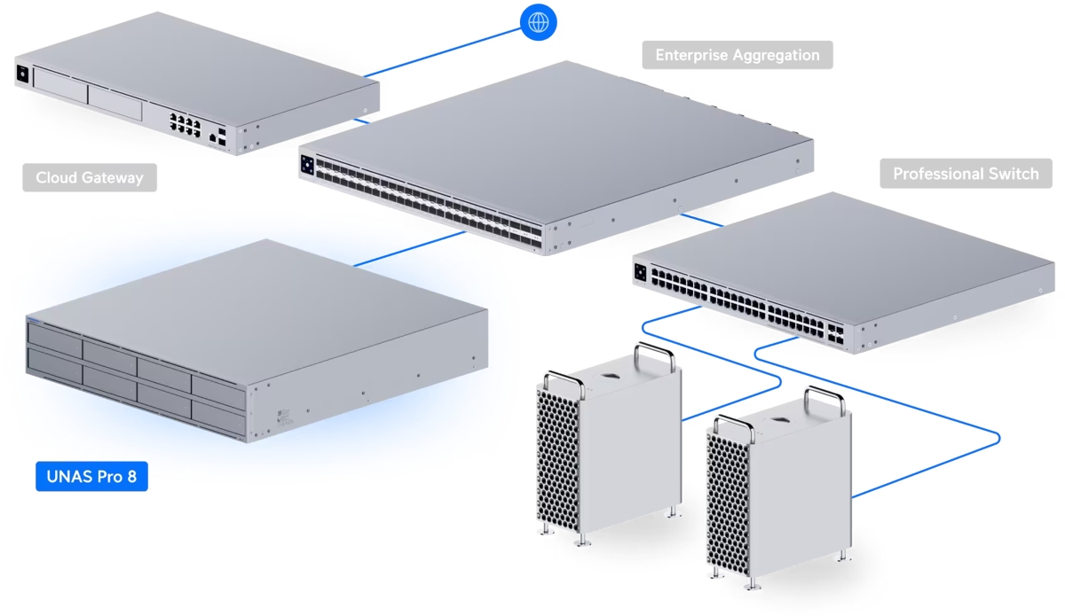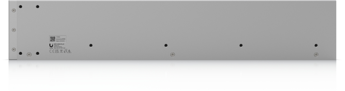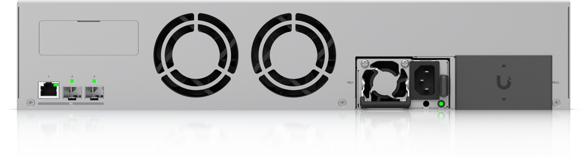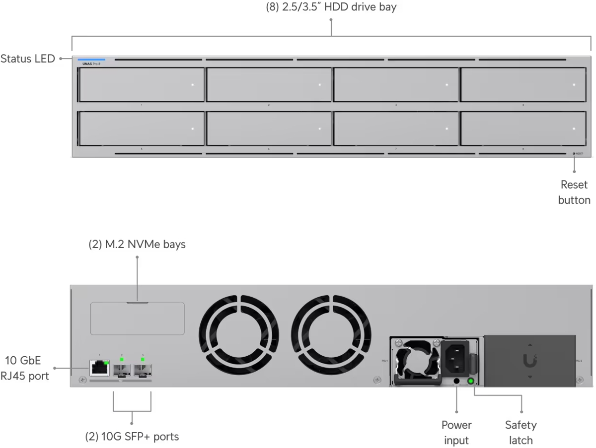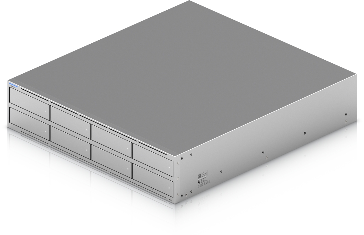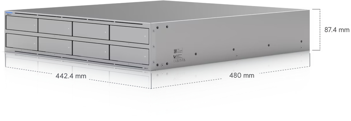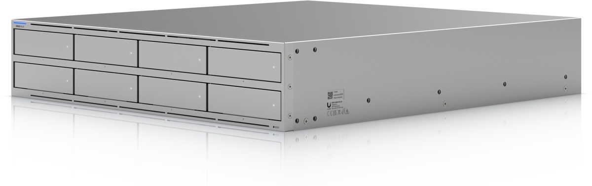 UniFi Network Attached Storage for 2U rack mounting with (8) 2.5/3.5" HDD bays, (2) M.2 NVMe SSD cache slots, 10 GbE RJ-45 networking and (2) 10G SFP+ ports for uplink. Powered by a quad-core ARM Cortex-A57 processor, complemented by 16 GB of RAM. It has two redundant hot-swappable power modules.