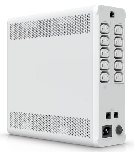 The Ubiquiti UniFi UPS is a backup power supply unit designed for network devices, ensuring their operation during a power outage. The device features a tower-type design and includes 10 power sockets for connecting equipment. Of these, 5 sockets (C13) provide surge protection, while the remaining 5 sockets (C13) offer combined protection—both surge and power outage protection. Continuous power is ensured by a hot-swap replaceable battery, which allows battery replacement while the unit remains operational, without the need to power it down. This ensures that connected devices remain continuously powered even during maintenance or battery replacement.