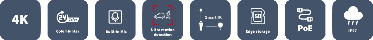 UNV IP bullet hybrid kamera IPC2128LB-ADF28K-DL disponuje 8MP snímačem (3840 x 2160 px) při 20fps, fixním 2.8mm (100,8°) objektivem, kombinovaným IR/bílé světlo přísvitem pro noční vidění na vzdálenost až 30m, krytím IP67, technologií 120dB True WDR a vestavěným mikrofonem. Do sítě lze kameru připojit pomocí 10/100Mbps LAN s podporou napájení přes PoE s maximální spotřebou 5,3W.