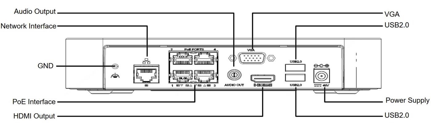 Do NVR rekordéru střední řady pro 4 kamery lze instalovat 1 HDD o velikosti až 6 TB. Rekordér je vybaven 4 POE porty 10/100Mbps a jedním ethernetem 10/100Mbps pro připojení do sítě. Lze napájet kamery celkovým výkonem 54W, přičemž maximální výkon na jednom portu je 30W. Vlastrní spotřeba zařízení je menší než 10W (bez připojeného HDD) a napájí se 48V DC adaptérem, který je součástí balení.
