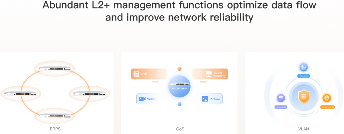 The Wi-Tek WI-CMS328GF is a reliable managed Gigabit L2+ switch with a switching capacity of 56 Gbps, (24) Gbit ports, (2) SFP slots and (2) Combo SFP slots. The switch is ideal for business environments requiring advanced network management, cloud-based control and extended L2+ features. The switch consumes 18.6W.