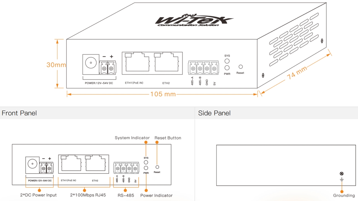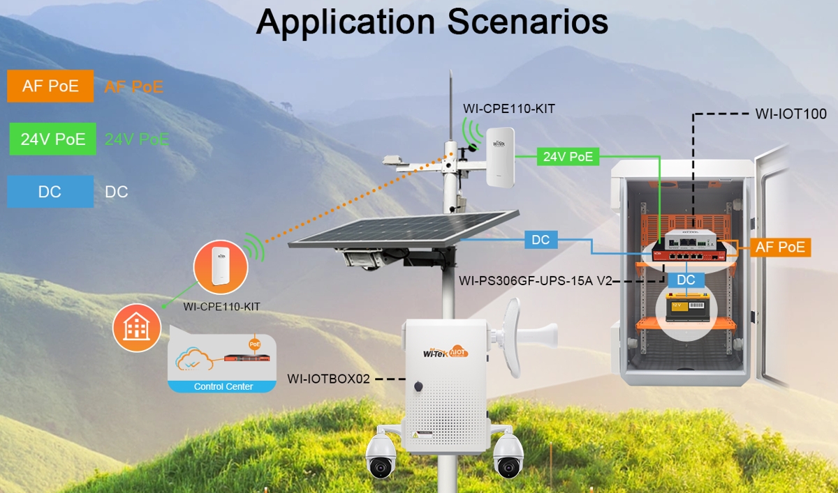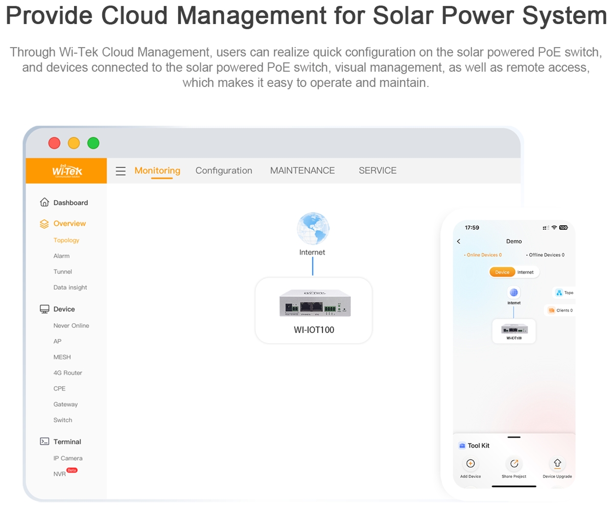 Wi-Tek WI-IOT100 is an IoT cloud controller for solar powered PoE switches, enabling remote monitoring, management, and visualization of photovoltaic system and battery data (including real-time and trend monitoring) via Wi-Tek Cloud. The device features (1) 10/100Mbps PoE-In port, (1) 10/100Mbps port and (1) RS-485 for communication with the solar switch. Power can be supplied via PoE or 12-54 VDC connectors.